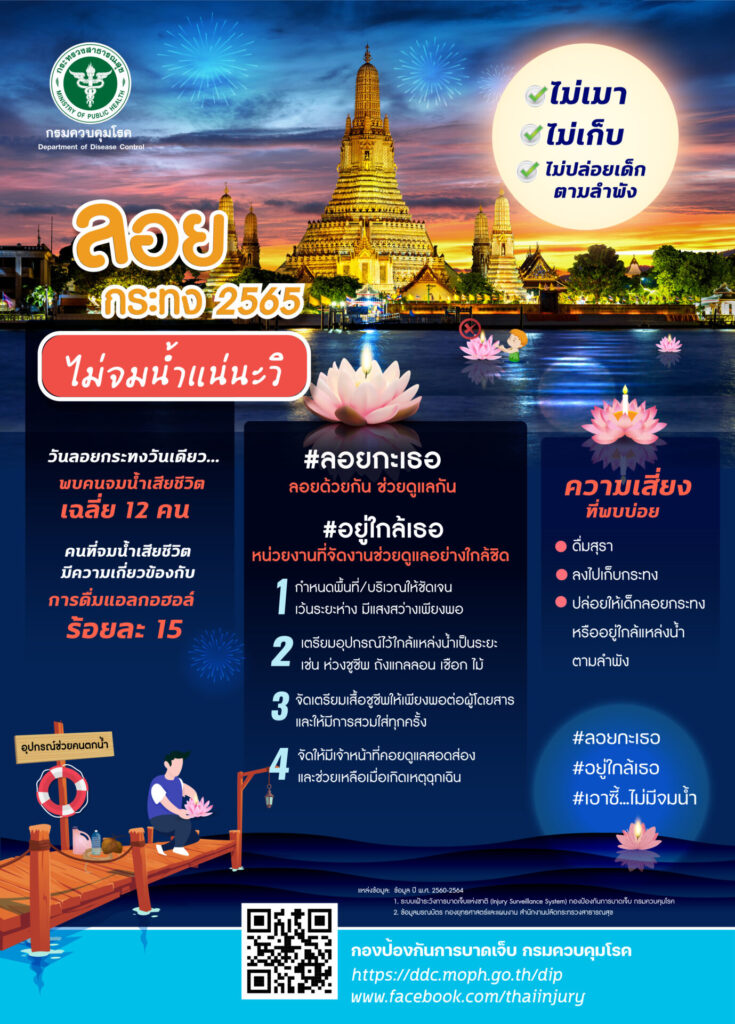 วันนี้ (7 พ.ย.65) นพ.ธเรศ กรัษนัยรวิวงค์ อธิบดีกรมควบคุมโรค กล่าวว่า วันลอยกระทงในปีนี้ตรงกับวันอังคารที่ 8 พ.ย.65 ซึ่งรัฐบาลอนุญาตให้จังหวัดต่างๆ จัดงานเทศกาลลอยกระทงได้ เพื่อเป็นการสืบสานประเพณี ขอขมาพระแม่คงคา และเป็นการกระตุ้นการท่องเที่ยว ซึ่งอาจมีโอกาสเสี่ยงที่จะเกิดอุบัติเหตุจมน้ำเสียชีวิตได้ โดยสถานการณ์การจมน้ำในช่วงวันลอยกระทง 5 ปีที่ผ่านมา (ปี 2560-2564) จากข้อมูลมรณบัตร กองยุทธศาสตร์และแผนงาน สำนักงานปลัดกระทรวงสาธารณสุข พบว่าวันลอยกระทงวันเดียว มีคนจมน้ำเสียชีวิต 60 คน เฉลี่ยปีละ 12 คน และเป็นที่น่าสังเกตว่า ช่วงหลังวันลอยกระทงเพียง 1 วัน ของแต่ละปี จะพบว่ามีการจมน้ำเสียชีวิตสูงมากกว่าวันลอยกระทงถึง 1-2 เท่า กลุ่มอายุที่พบมากที่สุด คือ 45-59 ปี (ร้อยละ 30) เป็นเด็กอายุต่ำกว่า 15 ปี (ร้อยละ 14) เป็นเพศชายมากกว่าเพศหญิงเกือบ 5 เท่า