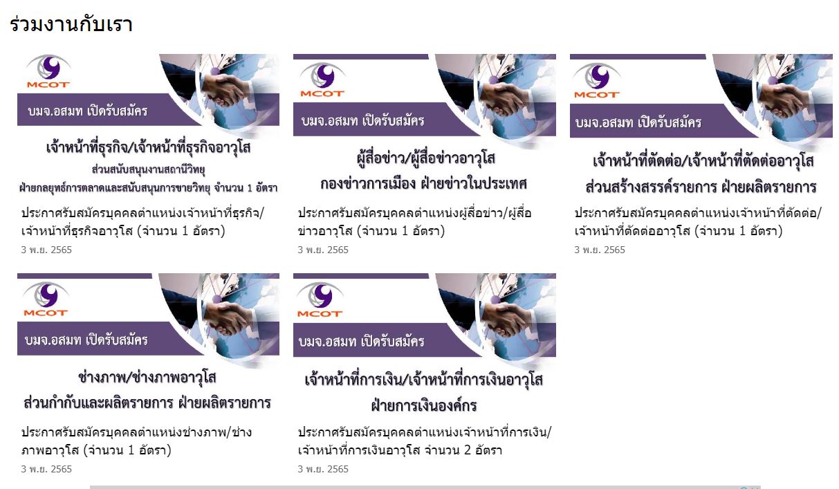 บริษัท อสมท จำกัด (มหาชน) เปิดรับสมัครบุคคลเพื่อสอบคัดเลือกเข้าปฏิบัติงานในตำแหน่ง ระดับเจ้าหน้าที่/เจ้าหน้าที่อาวุโส (จำนวน 6 อัตรา) ผู้สนใจสามารถดูรายละเอียดเพิ่มเติมได้ที่ https://www.mcot.net/category/ร่วมงานกับเรา