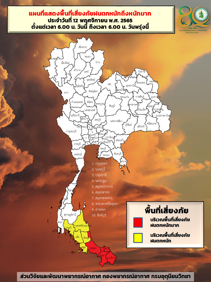 กรมอุตุนิยมวิทยา เผยร่องมรสุมพาดผ่านตอนล่างของภาคใต้เข้าสู่หย่อมความกดอากาศต่ำที่ปกคลุมบริเวณชายฝั่งของประเทศมาเลเซีย ประกอบกับมรสุมตะวันออกเฉียงเหนือยังคงพัดปกคลุมอ่าวไทย ภาคใต้ และทะเลอันดามัน ในขณะที่ลมตะวันออกพัดปกคลุมภาคใต้ตอนล่าง ลักษณะเช่นนี้ทำให้ภาคใต้ตอนล่างมีฝนตกหนักถึงหนักมากบางแห่ง ขอให้ประชาชนบริเวณดังกล่าวระวังอันตรายจากฝนตกหนักถึงหนักมากและฝนที่ตกสะสมซึ่งอาจทำให้เกิดน้ำท่วมฉับพลันและน้ำป่าไหลหลาก โดยเฉพาะพื้นที่ลาดเชิงเขาใกล้ทางน้ำไหลผ่านและพื้นที่ลุ่มไว้ด้วย
