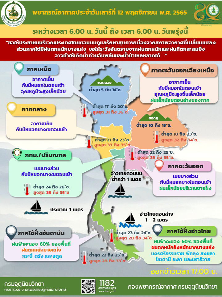 ลมตะวันออกเฉียงเหนือ ความเร็ว 15-30 กม./ชม. ทะเลมีคลื่นสูงประมาณ 1 เมตร บริเวณที่มีฝนฟ้าคะนองคลื่นสูงมากกว่า 1 เมตร - กรุงเทพและปริมณฑล เมฆบางส่วนกับมีหมอกบางในตอนเช้า อุณหภูมิต่ำสุด 24-26 องศาเซลเซียส อุณหภูมิสูงสุด 33-35 องศาเซลเซียส ลมตะวันออกเฉียงเหนือ ความเร็ว 10-20 กม./ชม. -สำนักข่าวไทย