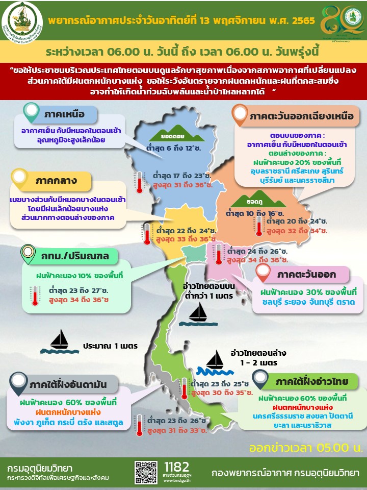 กทม. 13 พ.ย.- กรมอุตุฯ เผยอากาศเปลี่ยน ‘เหนือ-อีสาน’ อุณหภูมิสูงขึ้นเล็กน้อย ยอดดอยยังหนาว เกือบทั่วทุกภาคมีฝน เตือนภาคใต้ระวังน้ำท่วมฉับพลัน