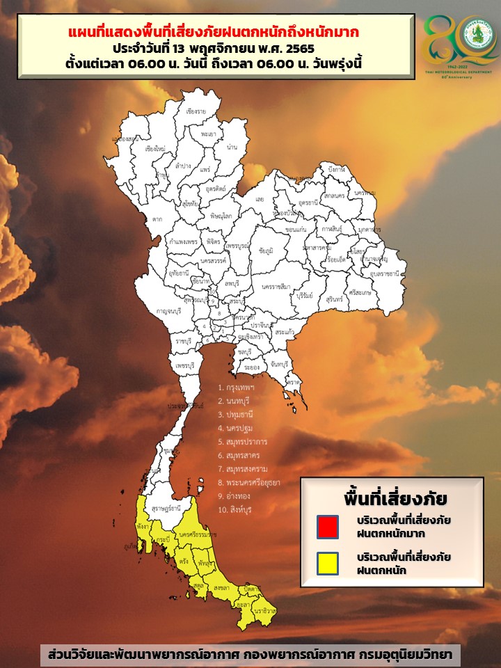 กรมอุตุนิยมวิทยา เผยร่องมรสุมพาดผ่านตอนล่างของภาคใต้เข้าสู่หย่อมความกดอากาศต่ำที่ปกคลุมบริเวณช่องแคบมะละกาและประเทศมาเลเซีย ประกอบกับมรสุมตะวันออกเฉียงเหนือยังคงพัดปกคลุมอ่าวไทยตอนบน ในขณะที่ลมตะวันออกพัดปกคลุมภาคใต้ตอนล่าง และทะเลอันดามัน ลักษณะเช่นนี้ทำให้ภาคใต้ตอนล่างมีฝนตกต่อเนื่องและมีฝนตกหนักบางแห่ง ขอให้ประชาชนบริเวณดังกล่าวระวังอันตรายจากฝนตกหนักและฝนที่ตกสะสมซึ่งอาจทำให้เกิดน้ำท่วมฉับพลันและน้ำป่าไหลหลาก โดยเฉพาะพื้นที่ลาดเชิงเขาใกล้ทางน้ำไหลผ่านและพื้นที่ลุ่มไว้ด้วย