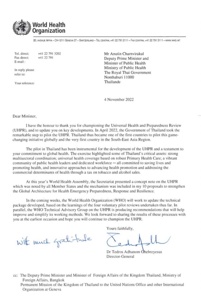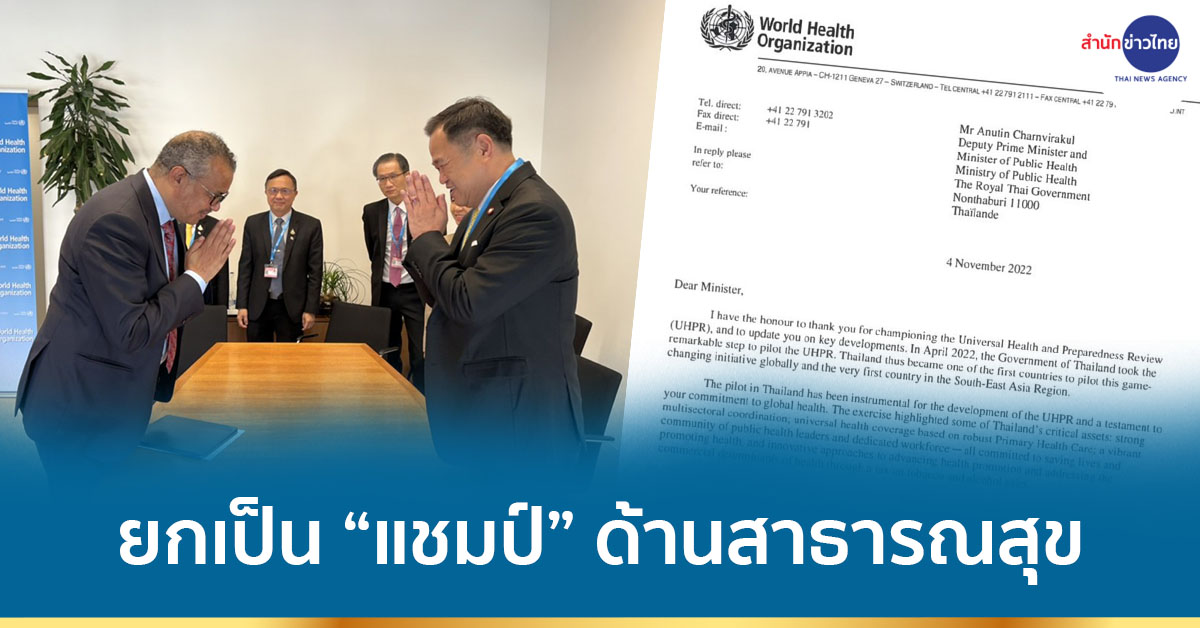 นายพลพีร์ สุวรรณฉวี รองเลขาธิการนายกรัฐมนตรีฝ่ายการเมือง เปิดเผยกับผู้สื่อข่าวระบุว่า ล่าสุด ประเทศไทย เพิ่งได้รับข่าวดี เมื่อนายอนุทิน ชาญวีรกูล รองนายกรัฐมนตรี และรัฐมนตรีว่าการกระทรวงสาธารณสุข ได้รับหนังสือจากองค์การอนามัยโลก หรือ WHO โดยนายแพทย์เท็ดรอส อันฮานอม กีเบรเยซุส ผู้อำนวยการใหญ่องค์การอนามัยโลก เมื่อวันที่ 4 พฤศจิกายนที่ผ่านมา เนื้อความด้านในระบุว่า ขอบคุณประเทศไทย ในฐานะ “แชมป์เปียน” ซึ่งมีการเตรียมความพร้อมด้านระบบสาธารณสุข ไปจนถึงการวางระบบดูแลสุขภาพประชาชนแบบถ้วนหน้า (Universal Health and Preparedness Review (UHPR)) ไว้อย่างยอดเยี่ยม และนับตั้งแต่เดือนเมษายนที่ผ่านมา ประเทศไทยได้กลายมาเป็นประเทศนำร่องด้านการวางระบบสุขภาพ ที่น่าชื่นชม นี่คือหนึ่งในประเทศแรกๆ ของโลก และเป็นประเทศแรกของอาเซียน ที่เปิดกว้างให้หน่วยงานสากลเข้ามาประเมิน เป็นจุดเริ่มต้นที่สำคัญ ในการยกระบบสาธารณสุขทั่วโลก สำหรับจุดเด่นของประเทศไทย ซึ่งเราได้รับรายงานมาจากการลงพื้นที่ตรวจสอบ ประกอบไปด้วย