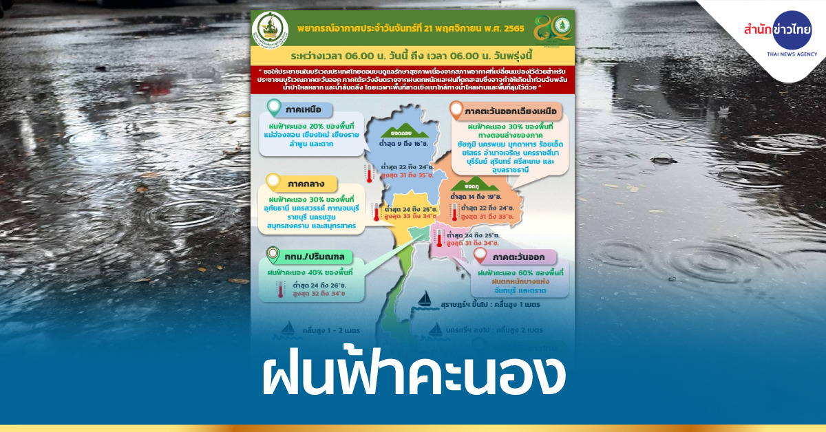 กรมอุตุนิยมวิทยา พยากรณ์อากาศ 24 ชั่วโมง หย่อมความกดอากาศต่ำกำลังแรงปกคลุมทะเลจีนใต้ตอนล่าง คาดว่าจะเคลื่อนผ่านปลายแหลมญวนและเข้าสู่อ่าวไทยช่วงวันที่ 23-24 พ.ย.65 ประกอบกับร่องมรสุมพาดผ่านภาคใต้ตอนกลาง ลักษณะเช่นนี้ทำให้ภาคตะวันออกและภาคใต้ มีฝนตกหนักบางแห่ง ขอให้ประชาชนบริเวณดังกล่าวระวังอันตรายจากฝนตกหนักและฝนที่ตกสะสมซึ่งอาจทำให้เกิดน้ำท่วมฉับพลัน น้ำป่าไหลหลาก และน้ำล้นตลิ่ง โดยเฉพาะพื้นที่ลาดเชิงเขาใกล้ทางน้ำไหลผ่านและพื้นที่ลุ่ม ส่วนบริเวณความกดอากาศสูงหรือมวลอากาศเย็นกำลังอ่อนปกคลุมทะเลจีนใต้ ทำให้ลมตะวันออกและลมตะวันออกเฉียงใต้ในระดับบนยังคงพัดปกคลุมประเทศไทยตอนบน ส่งผลให้ภาคเหนือ ภาคตะวันออกเฉียงเหนือตอนล่าง ภาคกลางรวมทั้งกรุงเทพมหานครและปริมณฑล มีฝนฟ้าคะนองเกิดขึ้นได้บางพื้นที่ ขอให้ประชาชนบริเวณประเทศไทยตอนบนดูแลรักษาสุขภาพเนื่องจากสภาพอากาศที่เปลี่ยนแปลงไว้ด้วย