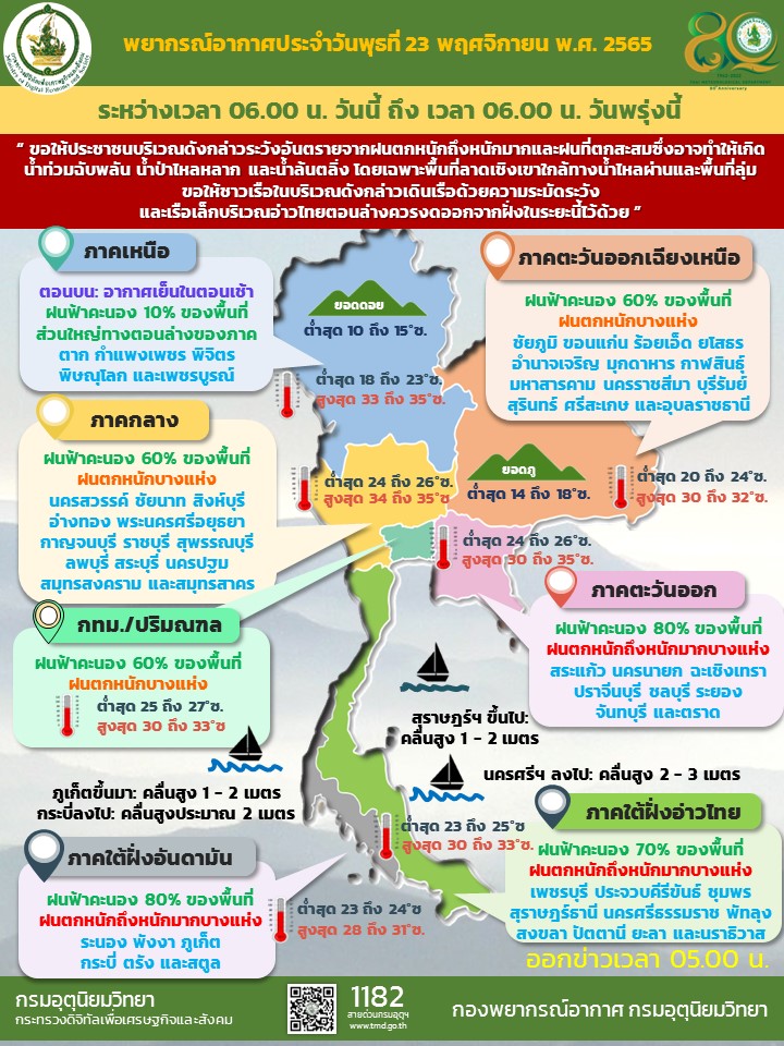กรมอุตุนิยมวิทยา พยากรณ์อากาศ 24 ชั่วโมง หย่อมความกดอากาศต่ำกำลังแรงปกคลุมอ่าวไทยตอนบนและภาคตะวันออก ประกอบกับร่องมรสุมพาดผ่านภาคใต้ตอนบน ลักษณะเช่นนี้ทำให้ประเทศไทยตอนบนมีฝนตกหนักบางแห่ง และมีฝนตกหนักถึงหนักมากบริเวณภาคตะวันออก และภาคใต้ ขอให้ประชาชนบริเวณดังกล่าวระวังอันตรายจากฝนตกหนักถึงหนักมากและฝนที่ตกสะสมซึ่งอาจทำให้เกิดน้ำท่วมฉับพลัน น้ำป่าไหลหลาก และน้ำล้นตลิ่ง โดยเฉพาะพื้นที่ลาดเชิงเขาใกล้ทางน้ำไหลผ่านและพื้นที่ลุ่ม