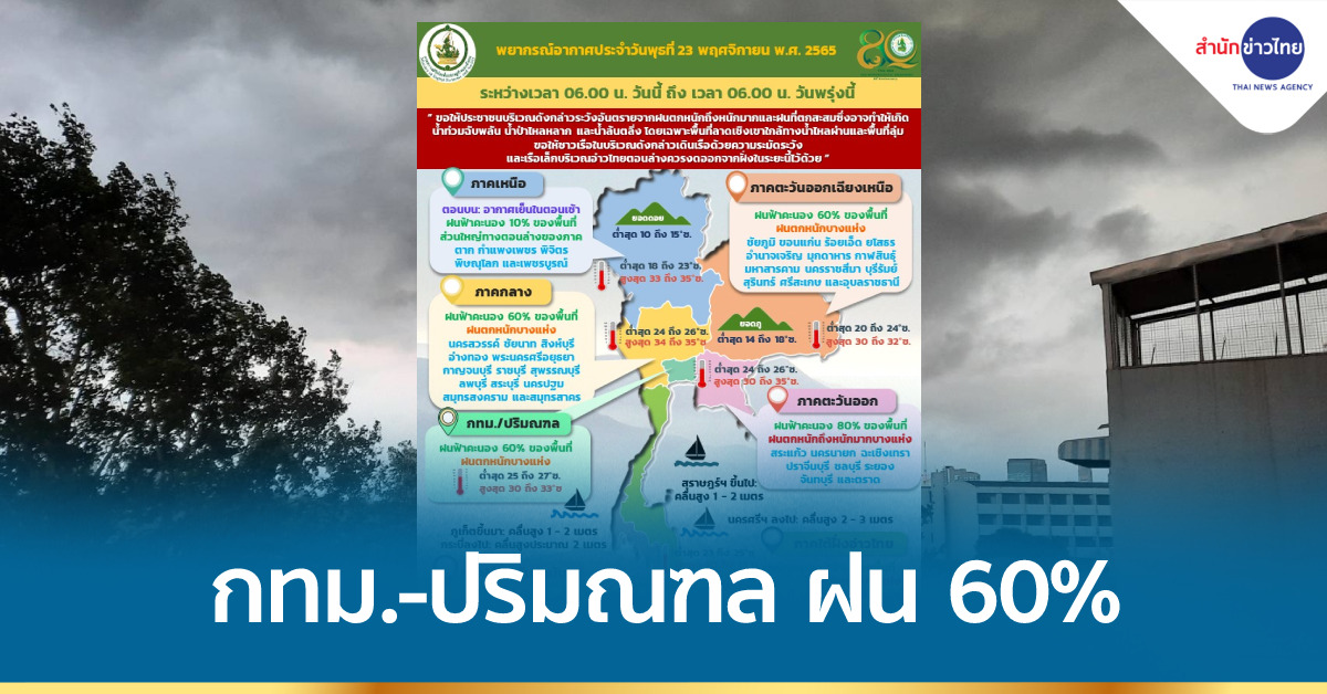 กรุงเทพฯ 23 พ.ย. – กรมอุตุฯ เผยไทยตอนบนมีฝนตกหนักบางแห่ง และฝนตกหนักถึงหนักมากบริเวณภาคตะวันออก-ภาคใต้ ขณะที่ กทม. – ปริมณฑล ฝนฟ้าคะนอง 60% ของพื้นที่