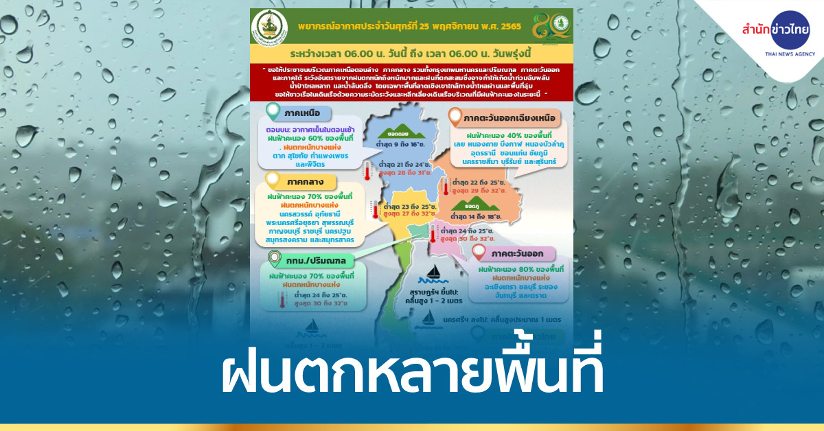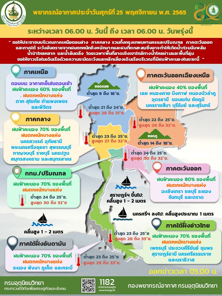 กรุงเทพฯ 25 พ.ย. – กรมอุตุฯ เผยภาคเหนือตอนล่าง ภาคกลาง รวมทั้ง กทม.-ปริมณฑล ภาคตะวันออก และภาคใต้ ฝนตกหนักบางแห่ง ระวังน้ำท่วมฉับพลัน น้ำป่าไหลหลาก
