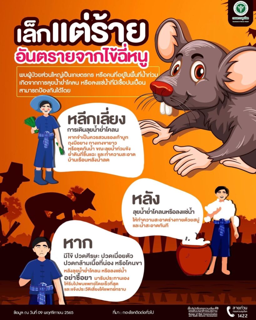 สำหรับสถานการณ์โรคไข้ฉี่หนูตั้งแต่วันที่ 1 มกราคม- 21 พฤศจิกายน 2565 พบผู้ป่วย 2,990 ราย เสียชีวิต 36 ราย กลุ่มอายุที่พบผู้ป่วยมากที่สุด คือ 45-54 ปี คิดเป็น 19.23% รองลงมา คือ 55-64 ปี คิดเป็น 17.73 % และ 35-44 ปี คิดเป็น 16.99% ตามลำดับ ส่วนใหญ่เป็นเกษตรกร 41% และรับจ้าง 27% โดยพื้นที่ที่พบอัตราป่วยสูงสุด ได้แก่ ภาคใต้ รองลงมา คือ ภาคตะวันออกเฉียงเหนือและภาคเหนือ ตามลำดับ พบมากในช่วงฤดูฝน เกิดจากการติดเชื้อแบคทีเรียเลปโตสไปราที่ปนออกมากับปัสสาวะของสัตว์นำโรค เช่น หนู สุกร โค กระบือ สุนัข เมื่อเชื้อถูกขับออกมาจะไหลลงสู่แหล่งน้ำ หนองน้ำ หรือบริเวณที่เป็นดินชื้นแฉะ โดยเชื้อจะมีชีวิตอยู่ในสิ่งแวดล้อมได้นานเป็นเดือน ขึ้นกับสภาพแวดล้อมของแต่ละพื้นที่