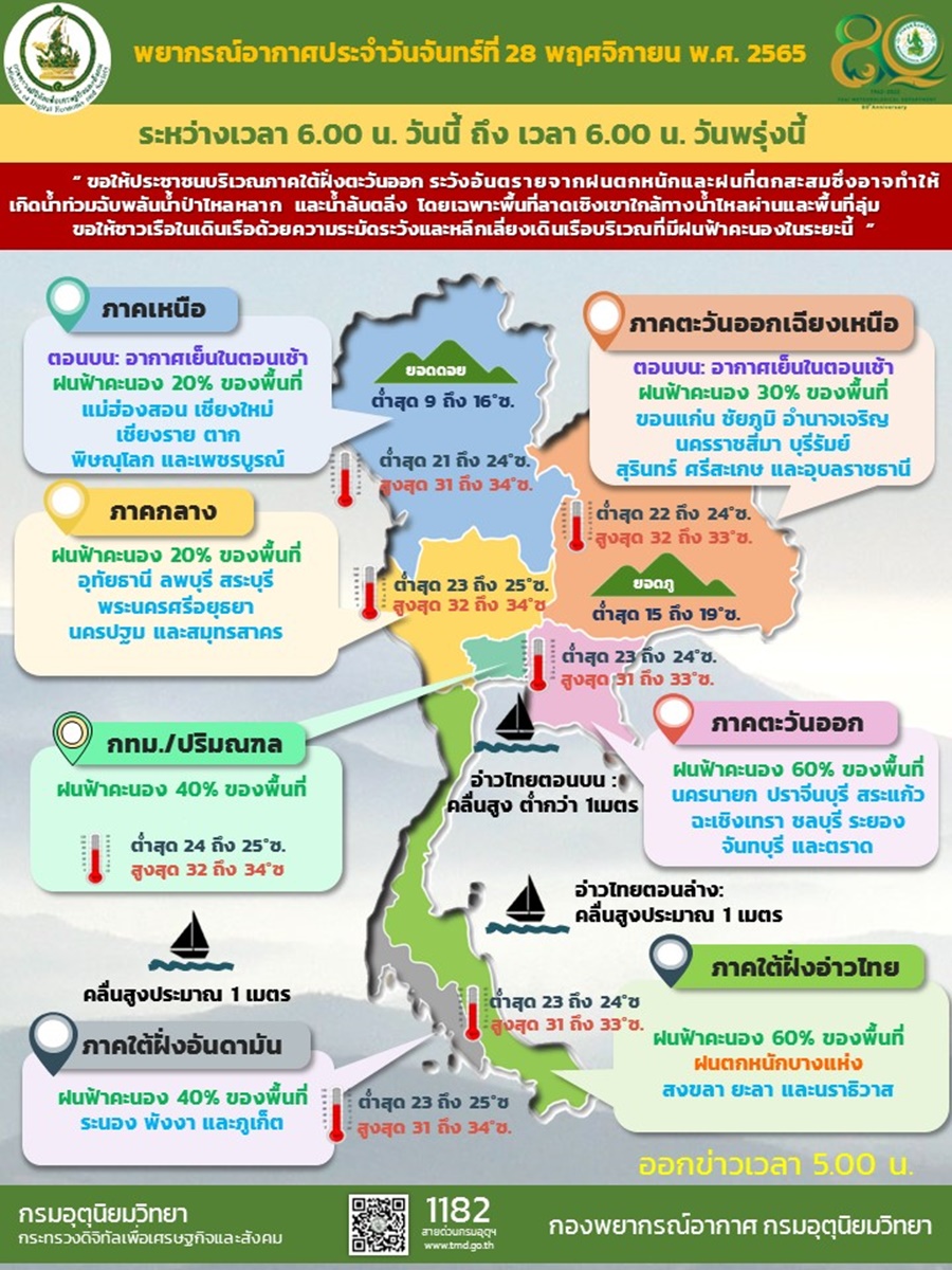 กรมอุตุนิยมวิทยา พยากรณ์อากาศ 24 ชั่วโมงข้างหน้า บริเวณความกดอากาศสูงหรือมวลอากาศเย็นกำลังอ่อนปกคลุมทะเลจีนใต้ ส่งผลทำให้มีลมตะวันออกเฉียงใต้พัดปกคลุมบริเวณประเทศไทยตอนบน ลักษณะเช่นนี้ทำให้ประเทศไทยตอนบนมีฝนฟ้าคะนองเกิดขึ้นได้ โดยภาคเหนือตอนบนและภาคตะวันออกเฉียงเหนือตอนบน มีอากาศเย็นในตอนเช้า ขอให้ประชาชนในบริเวณดังกล่าวดูแลรักษาสุขภาพ เนื่องจากสภาพอากาศที่เปลี่ยนแปลงในระยะนี้