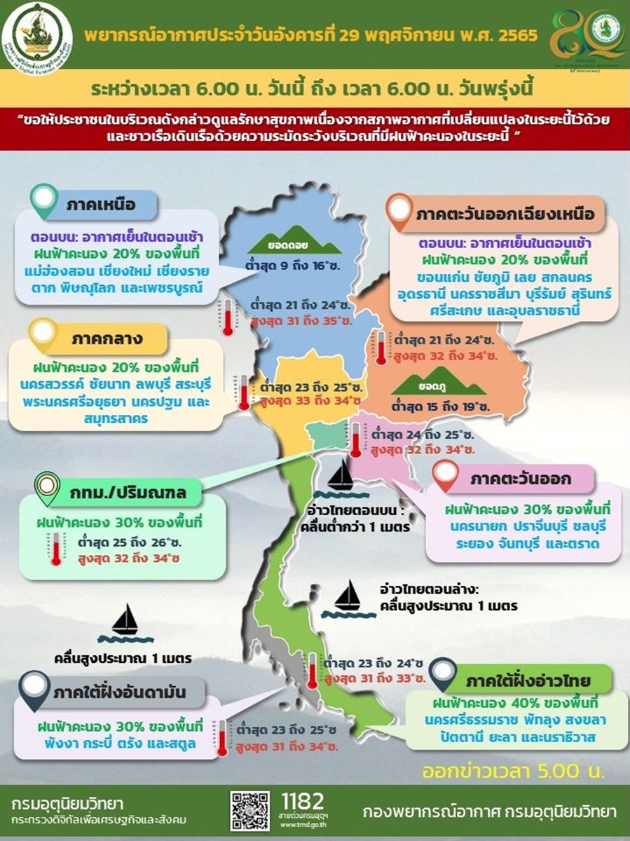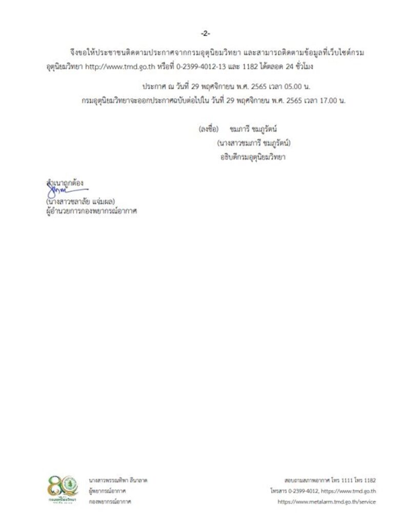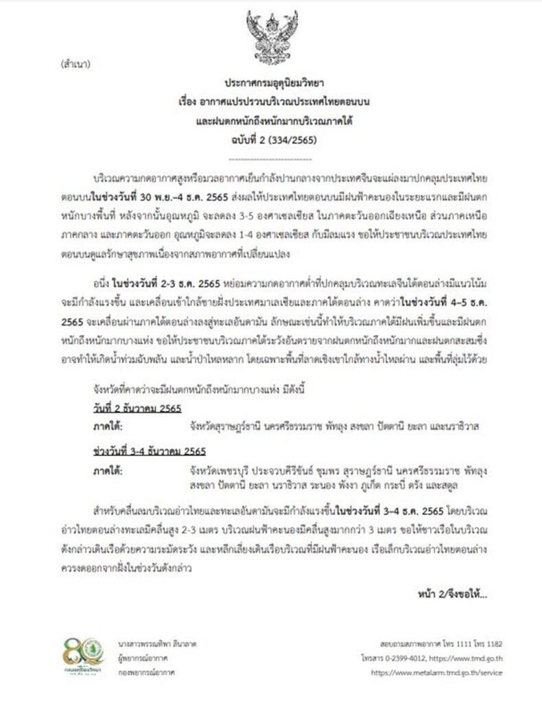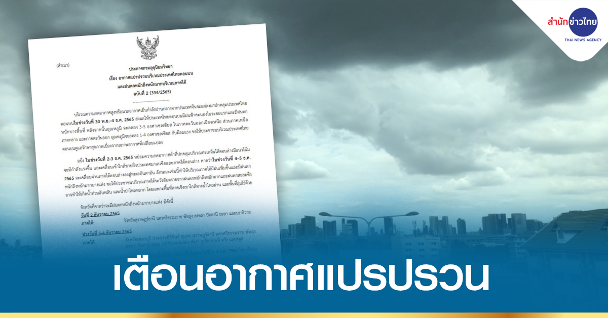 กรมอุตุนิยมวิทยา ออกประกาศ เรื่อง อากาศแปรปรวนบริเวณประเทศไทยตอนบน และฝนตกหนักถึงหนักมากบริเวณภาคใต้ ฉบับที่ 2 ระบุว่า บริเวณความกดอากาศสูงหรือมวลอากาศเย็นกำลังปานกลางจากประเทศจีนจะแผ่ลงมาปกคลุมประเทศไทยตอนบน ในช่วงวันที่ 30 พ.ย.-4 ธ.ค.65 ส่งผลให้ประเทศไทยตอนบนมีฝนฟ้าคะนองในระยะแรก และมีฝนตกหนักบางพื้นที่ หลังจากนั้นอุณหภูมิจะลดลง 3-5 องศาเซลเซียส ในภาคตะวันออกเฉียงเหนือ ส่วนภาคเหนือ ภาคกลาง และภาคตะวันออก อุณหภูมิจะลดลง 1-4 องศาเซลเซียส กับมีลมแรง ขอให้ประชาชนบริเวณประเทศไทยตอนบนดูแลรักษาสุขภาพ เนื่องจากสภาพอากาศที่เปลี่ยนแปลง