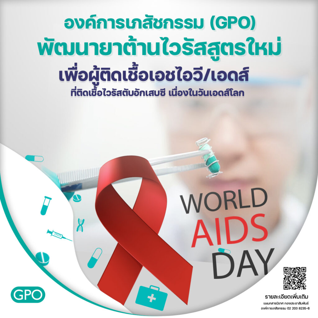 กรุงเทพฯ 30 พ.ย. – องค์การเภสัชกรรม (GPO) พัฒนายาต้านไวรัสสูตรใหม่ GPO-Hep C เพื่อผู้ติดเชื้อเอชไอวี/เอดส์ ที่ติดเชื้อไวรัสตับอักเสบซี เพิ่มประสิทธิภาพในการรักษาและเข้าถึงยาอย่างเท่าเทียม สอดคล้องแนวคิด “Equalize ทำให้เท่าเทียม” เนื่องในวันเอดส์โลก