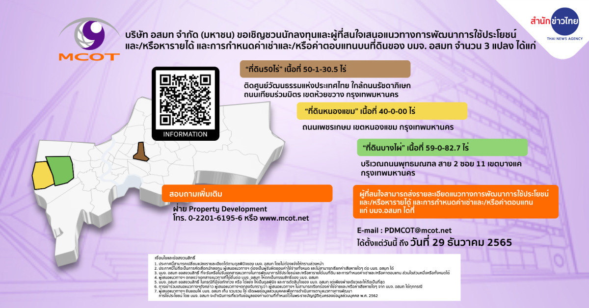 บริษัท อสมท จำกัด (มหาชน) ขอเชิญชวนนักลงทุนและผู้ที่สนใจเสนอแนวทางการพัฒนาการใช้ประโยชน์และ/หรือหารายได้ และการกำหนดค่าเช่าและ/หรือค่าตอบแทนบนที่ดินของ บมจ. อสมท จำนวน 3 แปลง