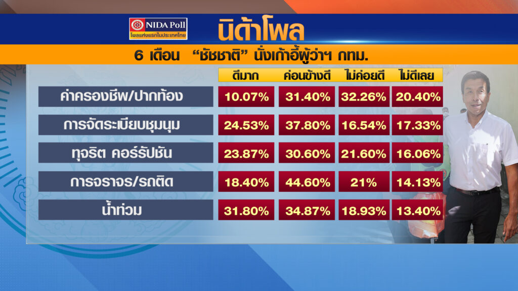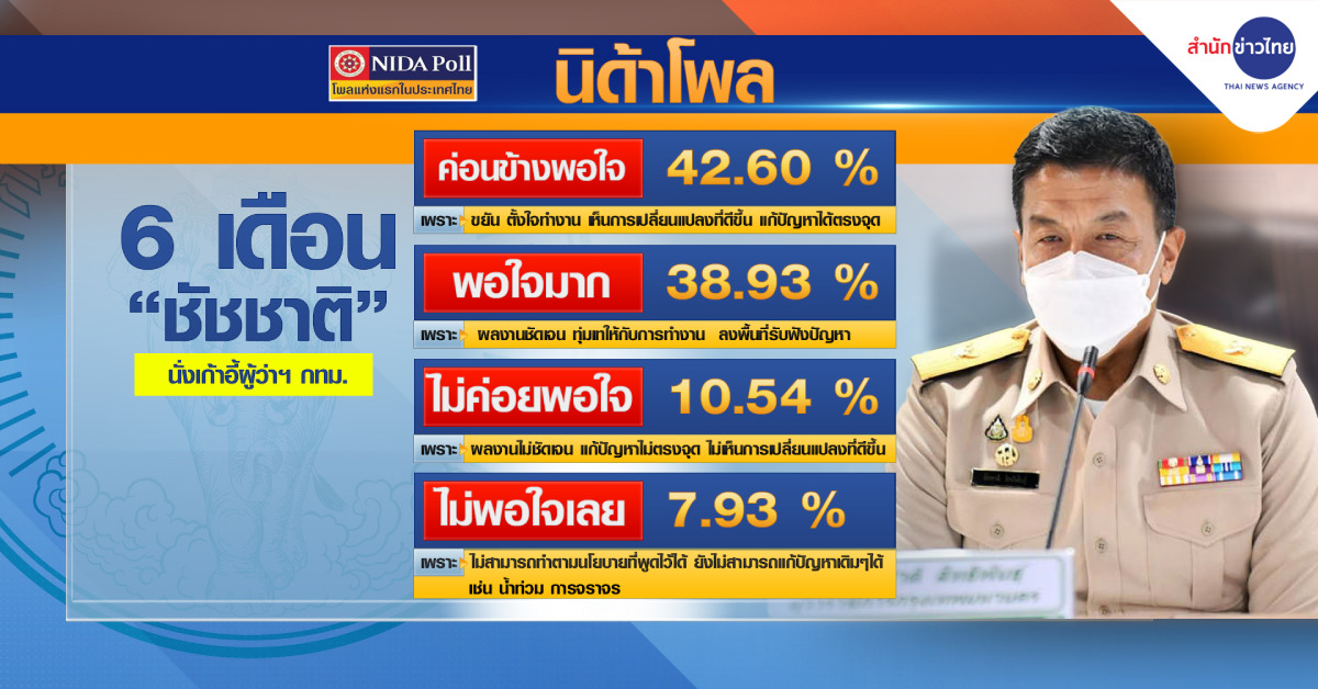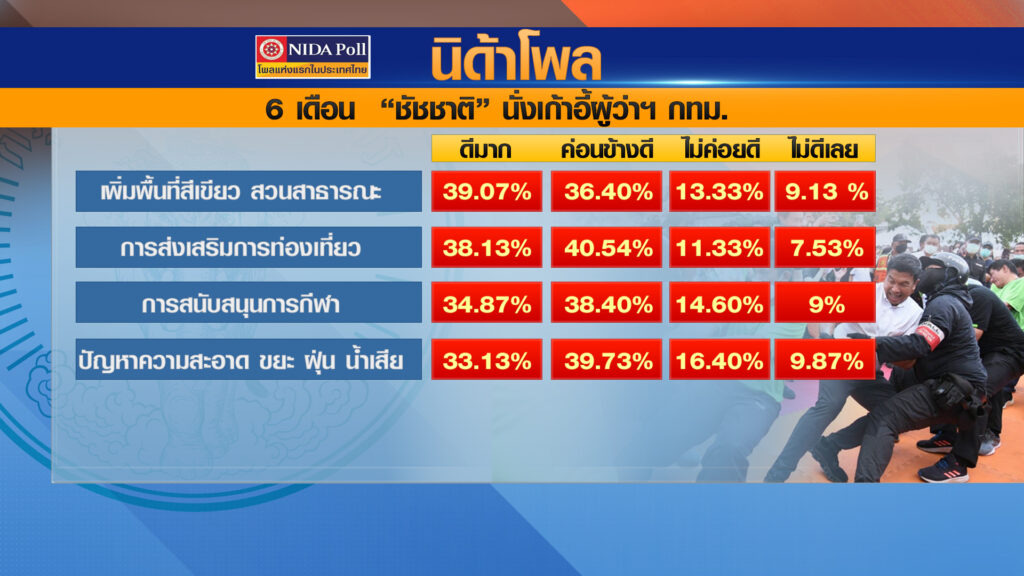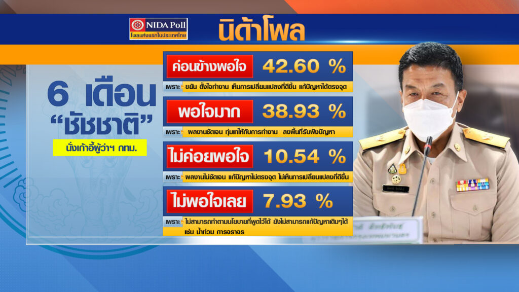 ศูนย์สำรวจความคิดเห็น “นิด้าโพล” เปิดเผยผลสำรวจของประชาชน เรื่อง “6 เดือนผู้ว่าฯ ชัชชาติ” ทำการสำรวจระหว่างวันที่ 25-30 พฤศจิกายน 2565 รวมทั้งสิ้น 1,500 หน่วยตัวอย่าง เกี่ยวกับการทำงานในรอบ 6 เดือนแรกของผู้ว่าราชการกรุงเทพมหานคร ดร.ชัชชาติ สิทธิพันธุ์