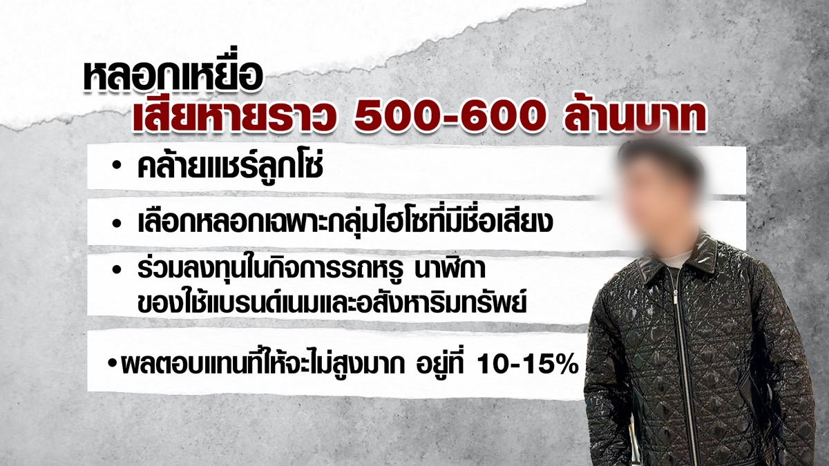 นายวรรณนพ อนุมาตรฉิมพลี ทนายกลุ่มผู้เสียหาย บอกว่า พฤติกรรมของไฮโซหนุ่ม มีลักษณะคล้ายแชร์ลูกโซ่ แต่จะเลือกหลอกเฉพาะกลุ่มไฮโซที่มีชื่อเสียงในวงการ ผลตอบแทนที่ให้จะไม่สูงมาก อยู่ที่ 10-15% จึงทำให้เหยื่อจำนวนไม่น้อยหลงเชื่อและร่วมลงทุน ขณะนี้เจ้าหน้าที่ได้ออกหมายจับไปแล้ว ตั้งแต่วันที่ 25 พ.ย.ที่ผ่านมา แต่เจ้าตัวหลบหนีไปเยอรมนี ตั้งแต่ราววันที่ 22 หรือ 23 พ.ย. โดยยังคงโพสต์ IG ใช้ชีวิตกินหรูอยู่สบาย ขณะเดียวกันก็ยังมีผู้ตกเป็นเหยื่อหลอกให้ลงทุนอยู่เรื่อยๆ จึงอยากให้ ก.ยุติธรรม ช่วยติดตามตัวไฮโซหนุ่มรายนี้กลับมาดำเนินคดี