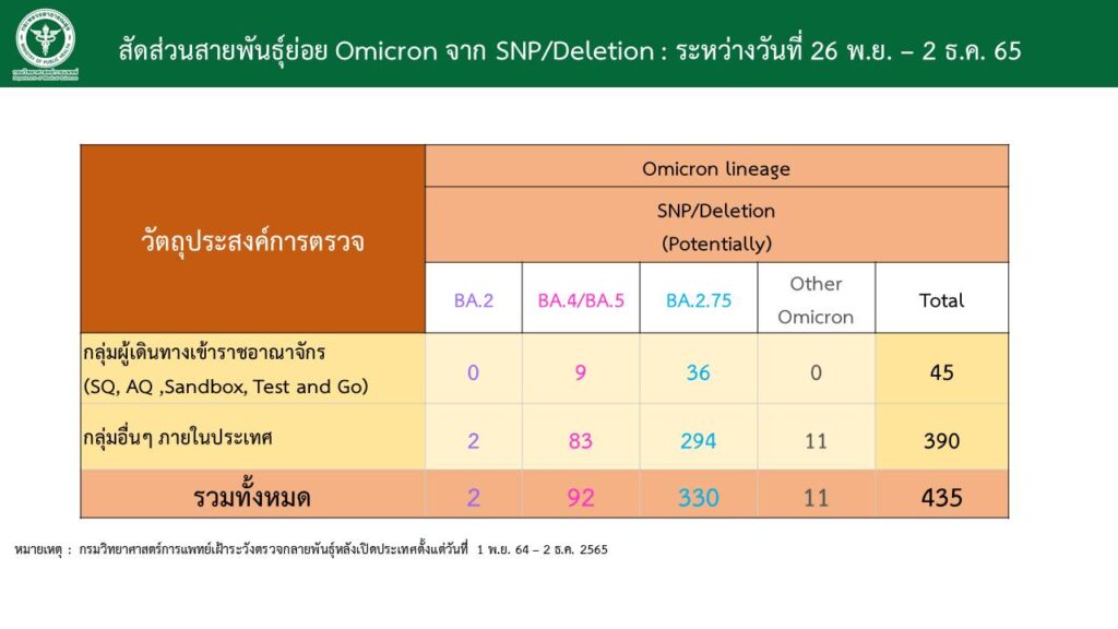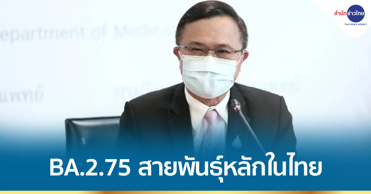นพ.ศุภกิจ ศิริลักษณ์ อธิบดีกรมวิทยาศาสตร์การแพทย์ เปิดเผยว่า การเฝ้าระวังสายพันธุ์โควิด-19 ในรอบสัปดาห์ที่ผ่านมา (26 พ.ย.-2 ธ.ค.) จากผลการตรวจแบบ SNP/Deletion จำนวน 435 ราย พบว่าภาพรวมสัดส่วนของสายพันธุ์ BA.2.75 เพิ่มขึ้นเป็น 75.9% จากสัปดาห์ก่อนที่มีสัดส่วน 58.9% แยกตามกลุ่ม พบว่ากลุ่มผู้ติดเชื้อในประเทศเพิ่มขึ้นจาก 60.1% เป็น 75.4% ทำให้ขณะนี้สายพันธุ์ BA.2.75 กลายเป็นสายพันธุ์หลักที่ระบาดในประเทศแทนที่สายพันธุ์ BA.5