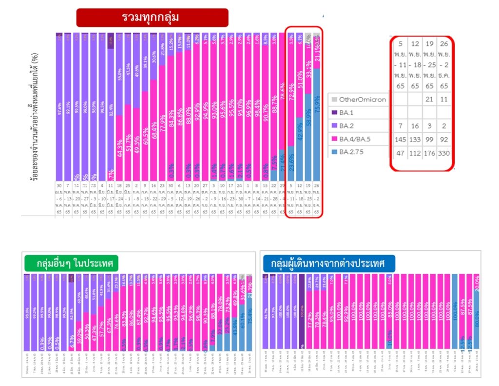 ทั้งนี้ จากการถอดรหัสพันธุกรรมแบบทั้งตัวของตัวอย่างในไทยจนถึงปัจจุบัน พบสายพันธุ์ BA.2.75 และลูกหลานของ BA.2.75 เช่น BA.2.75.2, BA.2.75.5.1 (BN.1), BA.2.75.1.2 (BL.2), BA.2.75.3.4.1.1.1.1 (CH.1.1) มากกว่า 856 ราย นอกจากนี้ ยังพบสายพันธุ์ BQ.1 ที่ระบาดในอเมริกาและยุโรป 13 ราย ส่วนสายพันธุ์ XBB และลูกหลาน ระบาดมากในสิงคโปร์ พบ 30 ราย