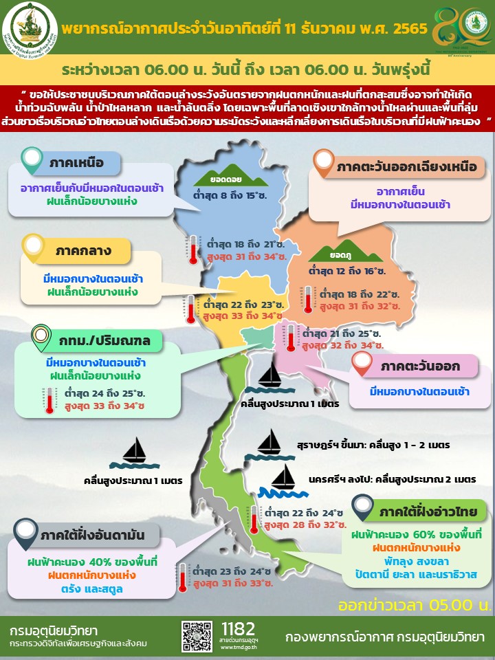 กรมอุตุนิยมวิทยาเผยหย่อมความกดอากาศต่ำปกคลุมบริเวณประเทศมาเลเซียและช่องแคบมะละกา ประกอบกับมรสุมตะวันออกเฉียงเหนือกำลังปานกลางยังคงพัดปกคลุมอ่าวไทย ภาคใต้ และทะเลอันดามัน ทำให้ภาคใต้ตอนล่างมีฝนตกหนักบางแห่ง ขอให้ประชาชนในบริเวณดังกล่าวระวังอันตรายจากฝนตกหนักและฝนที่ตกสะสม ซึ่งอาจทำให้เกิดน้ำท่วมฉับพลัน น้ำป่าไหลหลาก และน้ำล้นตลิ่ง โดยเฉพาะพื้นที่ลาดเชิงเขาใกล้ทางน้ำไหลผ่านและพื้นที่ลุ่ม ส่วนคลื่นลมบริเวณอ่าวไทยตอนล่างมีกำลังปานกลาง โดยมีคลื่นสูงประมาณ 2 เมตร บริเวณที่มีฝนฟ้าคะนองคลื่นสูงมากกว่า 2 เมตร ขอให้ชาวเรือในบริเวณดังกล่าวเดินเรือด้วยความระมัดระวังและหลีกเลี่ยงการเดินเรือในบริเวณที่มีฝนฟ้าคะนอง