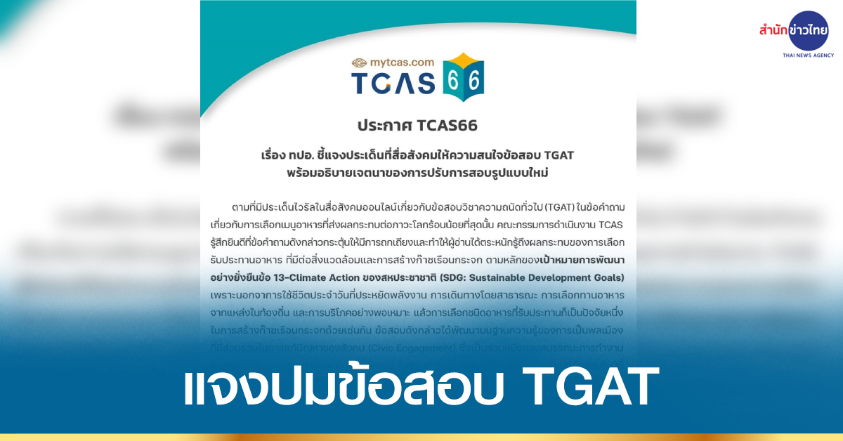 โดยในเฟซบุ๊กของ TCAS66 ได้ออกประกาศชี้แจงกรณีที่สื่อสังคมออนไลน์ให้ความสนใจข้อสอบ TGAT วิชาความถนัดทั่วไป พร้อมอธิบายเจตนาของการปรับการสอบรูปแบบใหม่ ตามที่มีประเด็นไวรัลในสื่อสังคมออนไลน์ ในข้อคำถามเกี่ยวกับการเลือกเมนูอาหารที่ส่งผลกระทบต่อภาวะโลกร้อนน้อยที่สุด