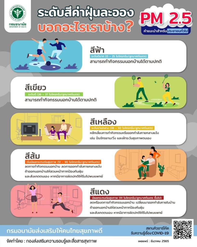 นพ.อรรถพล กล่าวต่อไปว่า การปฏิบัติตนต้องพิจารณาจากระดับสีค่าฝุ่น PM2.5 ดังนี้ 1. สีฟ้า ระดับดีมาก (0-25 มคก./ลบ.ม.) ประชาชนทุกคนสามารถทำกิจกรรมนอกบ้านได้ตามปกติ 2.สีเขียว ระดับดี (26-37 มคก./ลบ.ม.) ประชาชนทั่วไปสามารถทำกิจกรรมนอกบ้านได้ตามปกติ สำหรับกลุ่มเสี่ยงควรหลีกเลี่ยงการทำกิจกรรมนอกบ้าน และเฝ้าระวังสุขภาพตนเอง 3. สีเหลือง ระดับปานกลาง (38-50 มคก./ลบ.ม.) ประชาชนทั่วไปควรหลีกเลี่ยงการทำกิจกรรมนอกบ้าน และเฝ้าระวังสุขภาพตนเอง สำหรับกลุ่มเสี่ยงควรหลีกเลี่ยงการทำกิจกรรมนอกบ้าน ถ้าออกนอกบ้านให้สวมหน้ากากป้องกันฝุ่น และผู้มีโรคประจำตัวควรเฝ้าระวังสุขภาพตนเอง หากมีอาการผิดปกติให้รีบไปพบแพทย์ 4.สีส้ม ระดับที่เริ่มมีผลกระทบต่อสุขภาพ (51-90 มคก./ลบ.ม.) ประชาชนทั่วไปควรลดหรือจำกัดการทำกิจกรรมนอกบ้าน กลุ่มเสี่ยงควรลดเวลาการทำกิจกรรมนอกบ้าน ถ้าออกนอกบ้านให้สวมหน้ากากป้องกันฝุ่น และสังเกตตนเอง หากมีอาการผิดปกติให้รีบไปพบแพทย์ และผู้มีโรคประจำตัวควรเตรียมยาและอุปกรณ์ที่จำเป็นให้พร้อม 5.สีแดง ระดับที่มีผลกระทบต่อสุขภาพ (91 มคก./ลบ.ม.ขึ้นไป) ควรลดหรืองดการทำกิจกรรมนอกบ้าน เปลี่ยนมาออกกำลังกายในบ้าน ถ้าออกนอกบ้านให้สวมหน้ากากป้องกันฝุ่น และสังเกตตนเอง หากมีอาการผิดปกติให้รีบไปพบแพทย์ สำหรับกลุ่มเสี่ยงให้งดออกนอกบ้าน ถ้าออกนอกบ้านให้สวมหน้ากากป้องกันฝุ่นทุกครั้ง หากมีอาการผิดปกติให้รีบไปพบแพทย์ และผู้มีโรคประจำตัวควรเตรียมยาและอุปกรณ์ที่จำเป็นอย่างน้อย 5 วัน