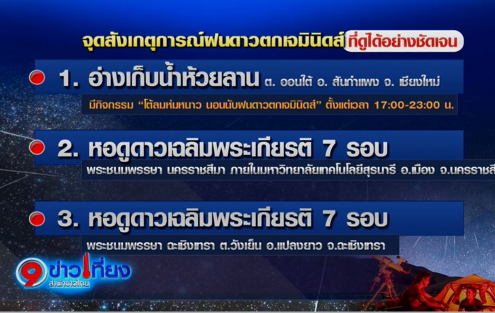 พร้อมแนะนำจุดสังเกตฝนดาวตกเจมินิดส์ที่สามารถดูได้อย่างชัดเจนทั้งหมด 3 แห่ง ประกอบด้วย บริเวณอ่างเก็บน้ำห้วยลาน ต. ออนใต้ อ. สันกำแพง จ. เชียงใหม่ ซึ่งคืนนี้มีการจัดกิจกรรมสังเกตปรากฏการณ์ฝนดาวตกเจมินิดส์ “โต้ลมห่มหนาว นอนนับฝนดาวตกเจมินิดส์” บริเวณรอบอ่างเก็บน้ำห้วยลานที่ค่อนข้างมืด ปราศจากแสงไฟรบกวน เหมาะแก่การสังเกตการณ์ฝนดาวตกเป็นอย่างยิ่ง ส่วนอีก 2 แห่ง คือ หอดูดาวเฉลิมพระเกียรติ 7 รอบพระชนมพรรษา นครราชสีมา ภายในมหาวิทยาลัยเทคโนโลยีสุรนารี อ.เมือง จ.นครราชสีมา และหอดูดาวเฉลิมพระเกียรติ 7 รอบพระชนมพรรษา ฉะเชิงเทรา ต.วังเย็น อ.แปลงยาว จ.ฉะเชิงเทรา.-สำนักข่าวไทย