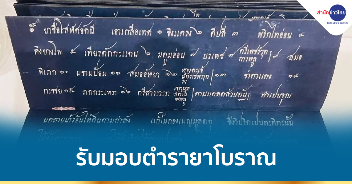 จ.พระนครศรีอยุธยา 15 ธ.ค.- กรมการแพทย์แผนไทยและการแพทย์ทางเลือก รับมอบตำรับตำรายาโบราณ อันทรงคุณค่า 2 ตำรับ ได้แก่ ตำรายาหมอพร เล่ม 1 ว่าด้วย พระคัมภีร์อติสารวรรคโบราณะกรรมแลปัจจุบันนะกรรม และตำรายาโบราณ พระโอสถปราสาททอง จากมูลนิธิราชสกุลอาภากร ในพลเรือเอก พระเจ้าบรมวงศ์เธอ กรมหลวงชุมพรเขตอุดมศักดิ์ ซึ่งสืบทอดมากว่า 300 ปี เพื่อให้เกิดประโยชน์ต่อวงการแพทย์แผนไทย รวมทั้งระบบการสาธารณสุขของประเทศ ตลอดจนการต่อยอดทางการวิจัย พัฒนา และสร้างเศรษฐกิจของประเทศชาติ