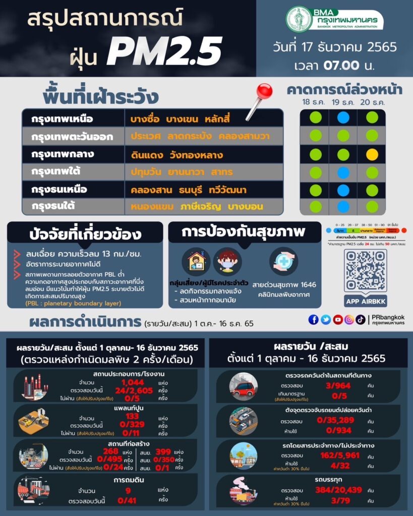 กรุงเทพฯ เฝ้าระวังคุณภาพอากาศในพื้นที่และตรวจสอบข้อมูล พบว่า วันนี้ (17 ธ.ค.65) ผลการตรวจวัดฝุ่นละอองขนาดเล็ก เวลา 07.00 น. มีแนวโน้มเพิ่มขึ้นดังนี้