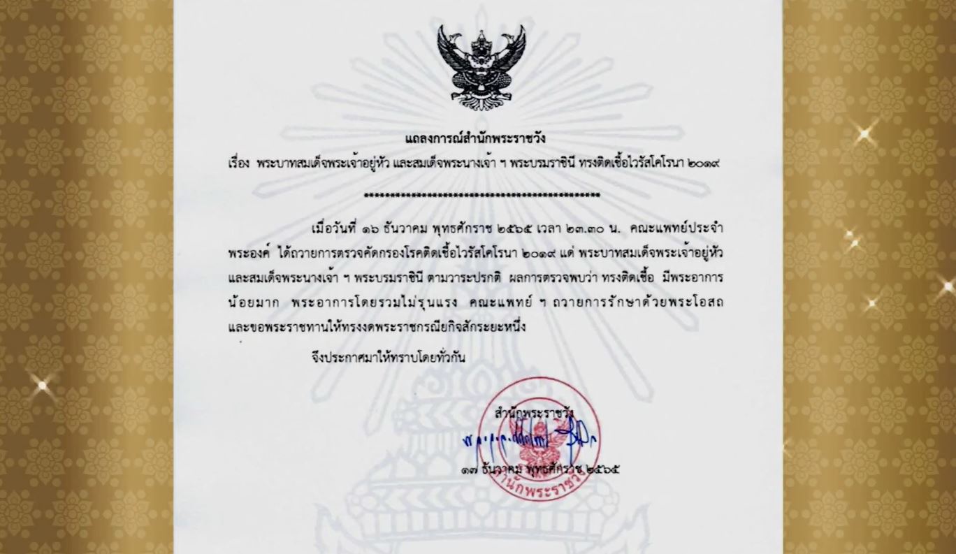 แถลงการณ์สำนักพระราชวัง เรื่อง พระบาทสมเด็จพระเจ้าอยู่หัว และสมเด็จพระนางเจ้าฯ พระบรมราชินี ทรงติดเชื้อไวรัสโคโรนา ๒๐๑๙