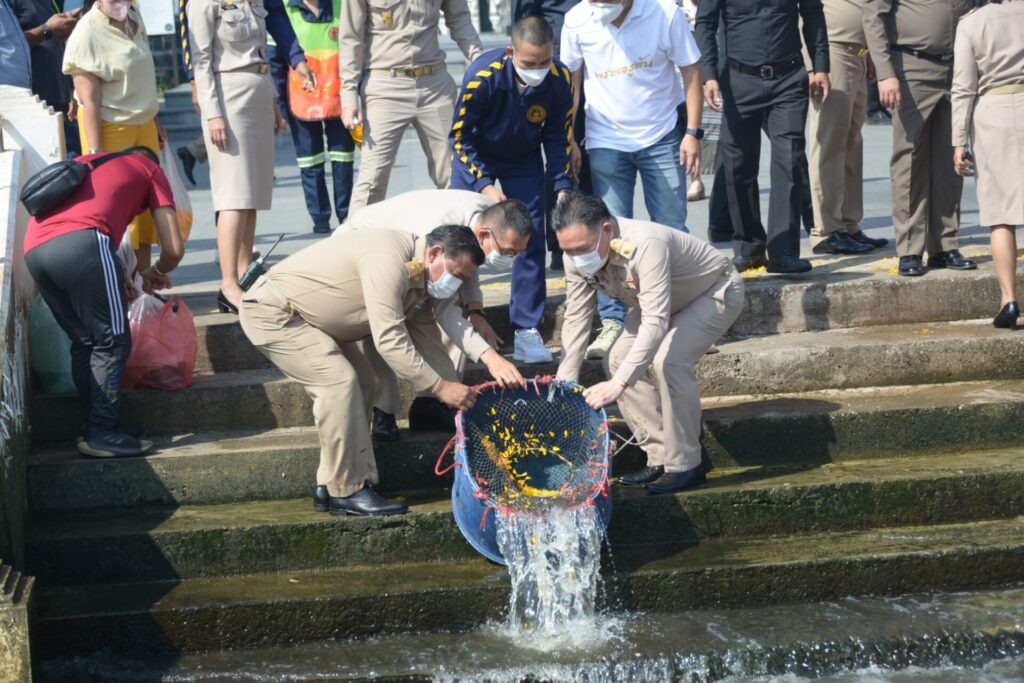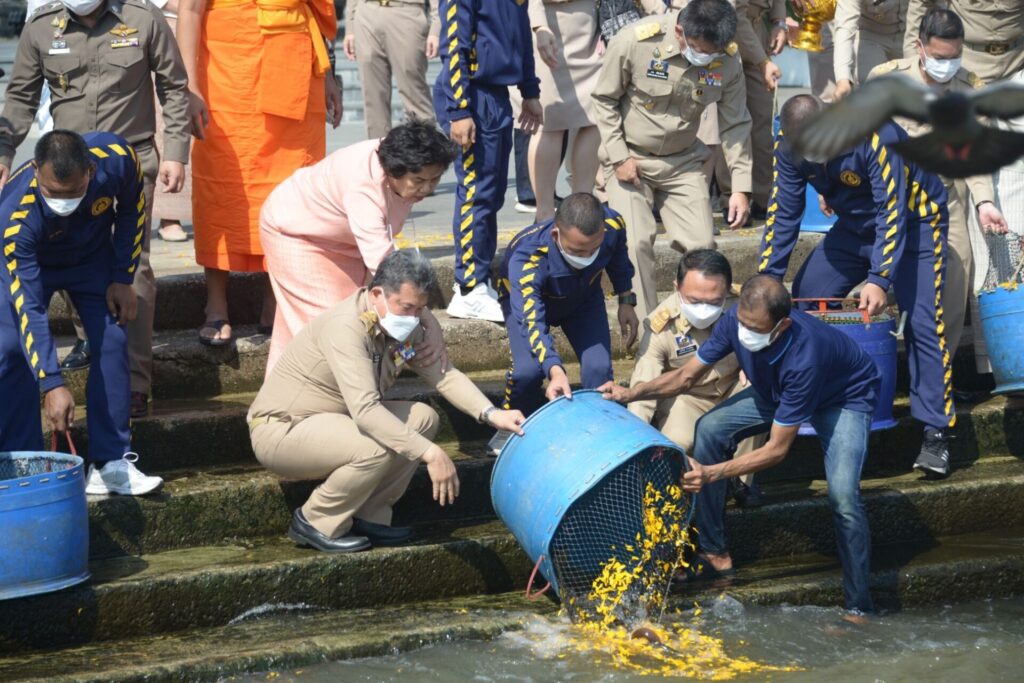 จากนั้น ในเวลา 10.39 น. ที่วัดระฆังโฆสิตารามวรมหาวิหาร เขตบางกอกน้อย กรุงเทพมหานคร นายสุทธิพงษ์ จุลเจริญ ปลัดกระทรวงมหาดไทย พร้อมด้วย ดร.วันดี กุญชรยาคง จุลเจริญ นายกสมาคมแม่บ้านมหาดไทย เป็นประธานในพิธีเจริญพระพุทธมนต์ เจริญจิตตภาวนา และถวายภัตตาหารเพลแด่พระสงฆ์ เพื่อถวายพระพรแด่สมเด็จพระเจ้าลูกเธอ เจ้าฟ้าพัชรกิติยาภา นเรนทิราเทพยวดี กรมหลวงราชสาริณีสิริพัชร มหาวัชรราชธิดา โดยมีพระเทพประสิทธิคุณ เจ้าอาวาสวัดระฆังโฆสิตารามวรมหาวิหาร พร้อมด้วยพระเถรานุเถระ 45 รูป ผู้บริหารระดับสูงกระทรวงมหาดไทย และภาคีเครือข่าย นำโดย นางธราพร อำนวยสาร ผอ.เขตบางกอกน้อย นางศศิธร เวชภูติ เจ้าพนักงานที่ดิน กทม. สาขาบางกอกน้อย พ.ต.อ.ศาสตรา อ่อนรัศมี ผกก.สน.บางกอกน้อย ว่าที่ ร.ต.เฉลิมรัฐ ติ่งอ่วม ผอ.โรงเรียนสตรีวัดระฆัง นายพงศ์พิษณุ สุพรรณ์ ผอ.โรงเรียนโฆสิตสโมสร และพุทธศาสนิกชน รวมกว่า 500 คน ร่วมพิธี โดยภายหลังเสร็จพิธี นายสุทธิพงษ์ จุลเจริญ ปลัดกระทรวงมหาดไทย พร้อมด้วย ดร.วันดี กุญชรยาคง จุลเจริญ นายกสมาคมแม่บ้านมหาดไทย และพระครูสมุห์วัชระ ภทฺทธมฺโม ผู้ช่วยเจ้าอาวาสวัดระฆังโฆสิตาราม นำคณะผู้บริหาร และผู้ร่วมพิธี ปล่อยพันธุ์ปลาหมอ ปลาช่อน ปลาไหล จำนวน 999 ตัว ลงสู่แม่น้ำเจ้าพระยา บริเวณหน้าวัดระฆังโฆสิตาราม เพื่อถวายพระพรและถวายเป็นพระกุศลแด่สมเด็จพระเจ้าลูกเธอ เจ้าฟ้าพัชรกิติยาภา นเรนทิราเทพยวดี กรมหลวงราชสาริณีสิริพัชร มหาวัชรราชธิดา
