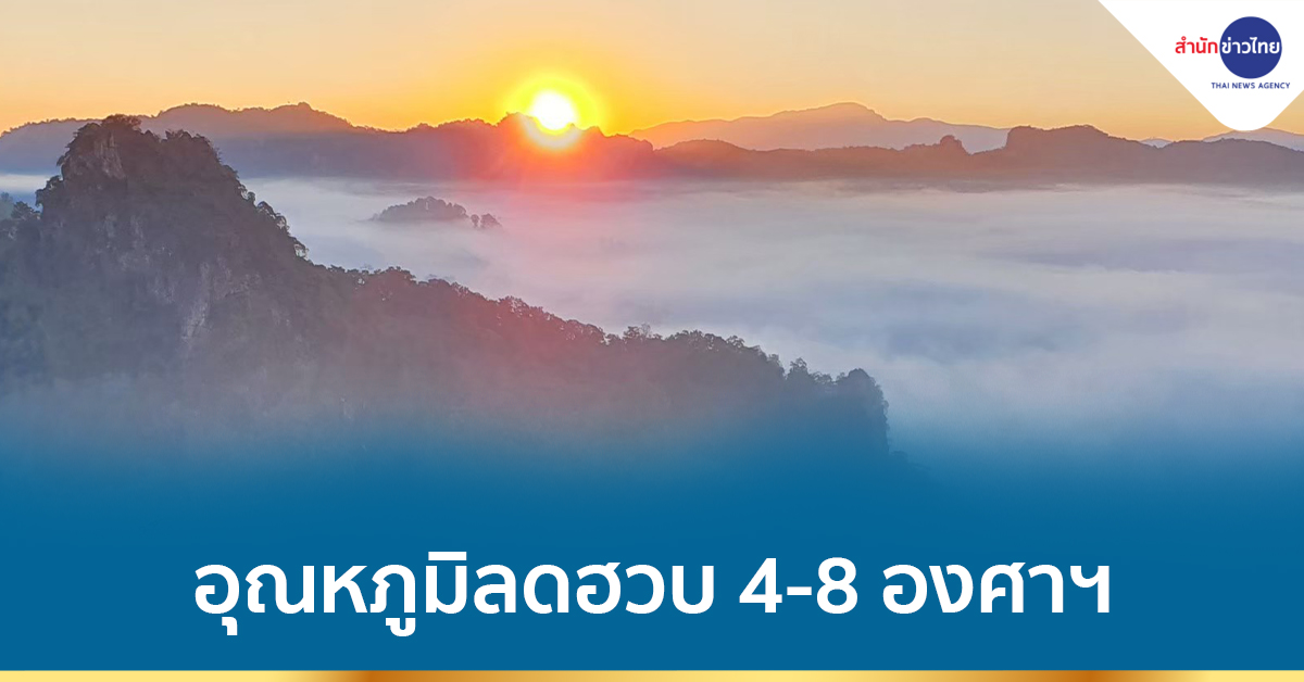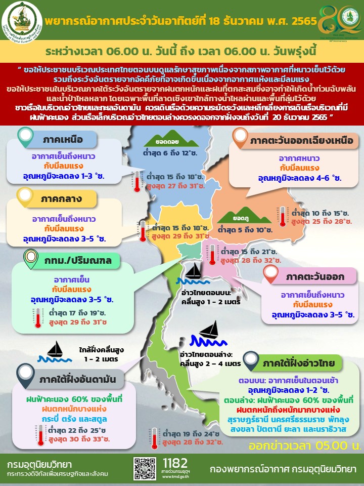 กทม. 18 ธ.ค.- กรมอุตุฯ เผยเกือบทั่วทุกภาค อากาศเย็นถึงหนาว อุณหภูมิลด 4-8 องศาฯ เตือนภาคใต้รับมือฝนตกหนัก-คลื่นสูง