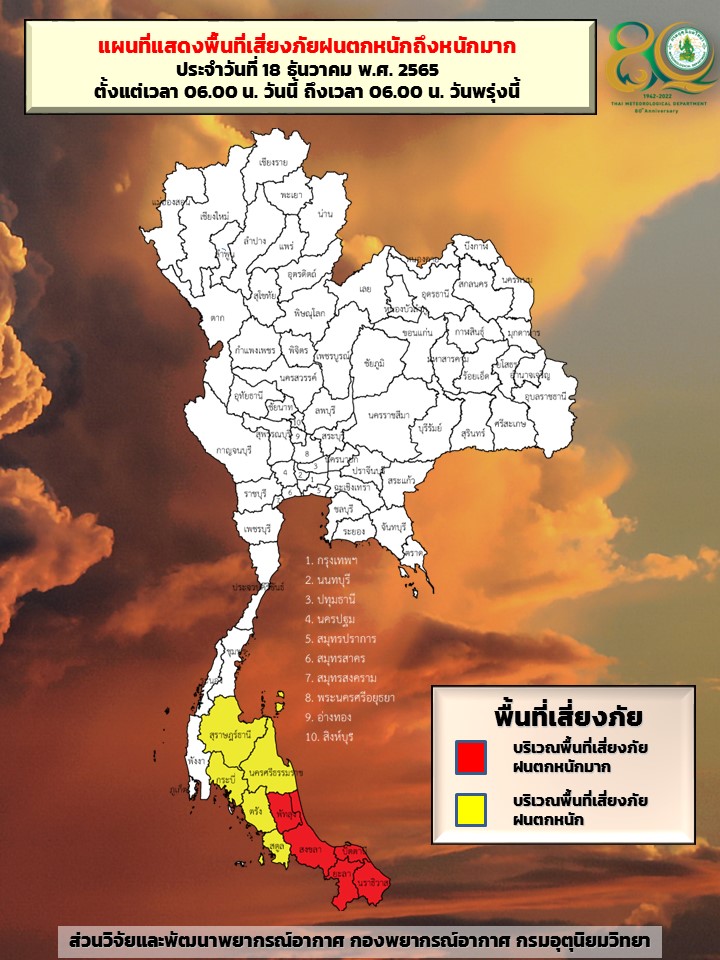 สำหรับมรสุมตะวันออกเฉียงเหนือที่พัดปกคลุมอ่าวไทย ภาคใต้ และทะเลอันดามัน มีกำลังแรงขึ้น ทำให้ภาคใต้มีฝนเพิ่มขึ้นและมีฝนตกหนักถึงหนักมากบางแห่ง ส่วนคลื่นลมบริเวณอ่าวไทยมีกำลังแรงขึ้น โดยอ่าวไทยและห่างฝั่งบริเวณทะเลอันดามันคลื่นสูง 2-4 เมตร บริเวณที่มีฝนฟ้าคะนองคลื่นสูงมากกว่า 4 เมตร ชาวเรือในบริเวณดังกล่าวควรเดินเรือด้วยความระมัดระวังและหลีกเลี่ยงการเดินเรือบริเวณที่มีฝนฟ้าคะนอง ส่วนเรือเล็กบริเวณอ่าวไทยตอนล่างควรงดออกจากฝั่งจนถึงวันที่ 20 ธันวาคม 2565 .-สำนักข่าวไทย