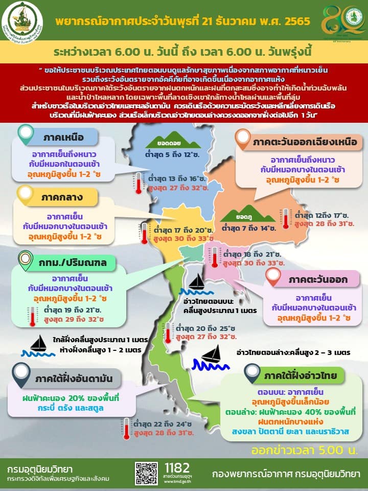 กรมอุตุฯ 21 ธ.ค. – กรมอุตุฯ เผยไทยตอนบนอุณหภูมิสูงขึ้น แต่ยังคงมีอากาศเย็นถึงหนาวในภาคเหนือและอีสาน ส่วนภาคกลาง รวมทั้งกรุงเทพฯ-ปริมณฑล ภาคตะวันออก และภาคใต้ตอนบน มีอากาศเย็นในตอนเช้า ขณะที่ภาคใต้ตอนล่างยังมีฝนตกหนักบางแห่ง