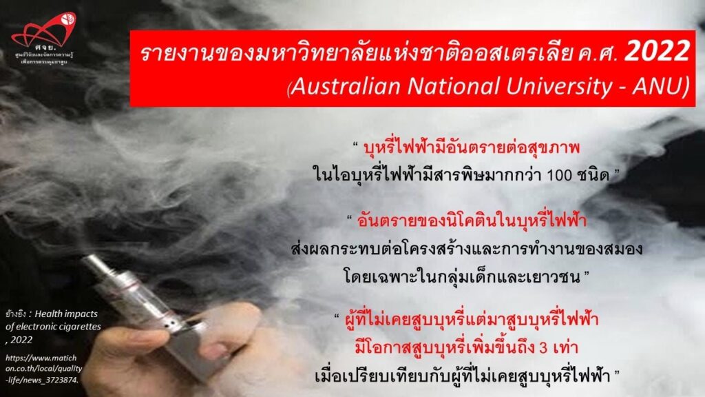 “สอดคล้องกับรายงานของมหาวิทยาลัยแห่งชาติออสเตรเลีย (Australian National University – ANU) ค.ศ.2022 ระบุว่า บุหรี่ไฟฟ้ามีอันตรายต่อสุขภาพในไอบุหรี่ไฟฟ้ามีสารพิษมากกว่า 100 ชนิด ซึ่งอันตรายของนิโคตินในบุหรี่ไฟฟ้า ส่งผลกระทบต่อโครงสร้างและการทำงานของสมองโดยเฉพาะในกลุ่มเด็กและเยาวชน โดยผู้ที่ไม่เคยสูบบุหรี่แต่มาสูบบุหรี่ไฟฟ้ามีโอกาสสูบบุหรี่เพิ่มขึ้นถึง 3 เท่า เมื่อเปรียบเทียบกับผู้ที่ไม่เคยสูบบุหรี่ไฟฟ้า และรายงานสรุปพฤติกรรมการสูบบุหรี่และการสูบบุหรี่ไฟฟ้าของ ANU ปี 2020 พบว่าอัตราการสูบบุหรี่มวนลดลงได้ด้วยมาตรการทางกฎหมายและการให้บริการช่วยเลิกบุหรี่ ซึ่งในกลุ่มคนที่เลิกบุหรี่ได้ส่วนใหญ่ใช้วิธีหักดิบ (cold turkey) ส่วนอัตราการสูบบุหรี่ไฟฟ้ากลับค่อยๆ เพิ่มสูงขึ้น โดยเฉพาะในกลุ่มเยาวชนอายุ 14-17 ปี ที่ไม่เคยสูบบุหรี่เลย มีการสูบบุหรี่ไฟฟ้าเพิ่มขึ้นถึง 5 เท่า และพบว่าผู้ที่เคยสูบบุหรี่ที่สูบบุหรี่ไฟฟ้าเพื่อช่วยเลิกบุหรี่มีโอกาสกลับเป็นผู้สูบบุหรี่ซ้ำสูง” ผศ.ดร.นพ.วิชช์ กล่าว