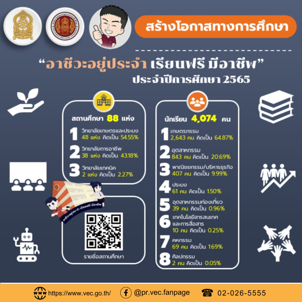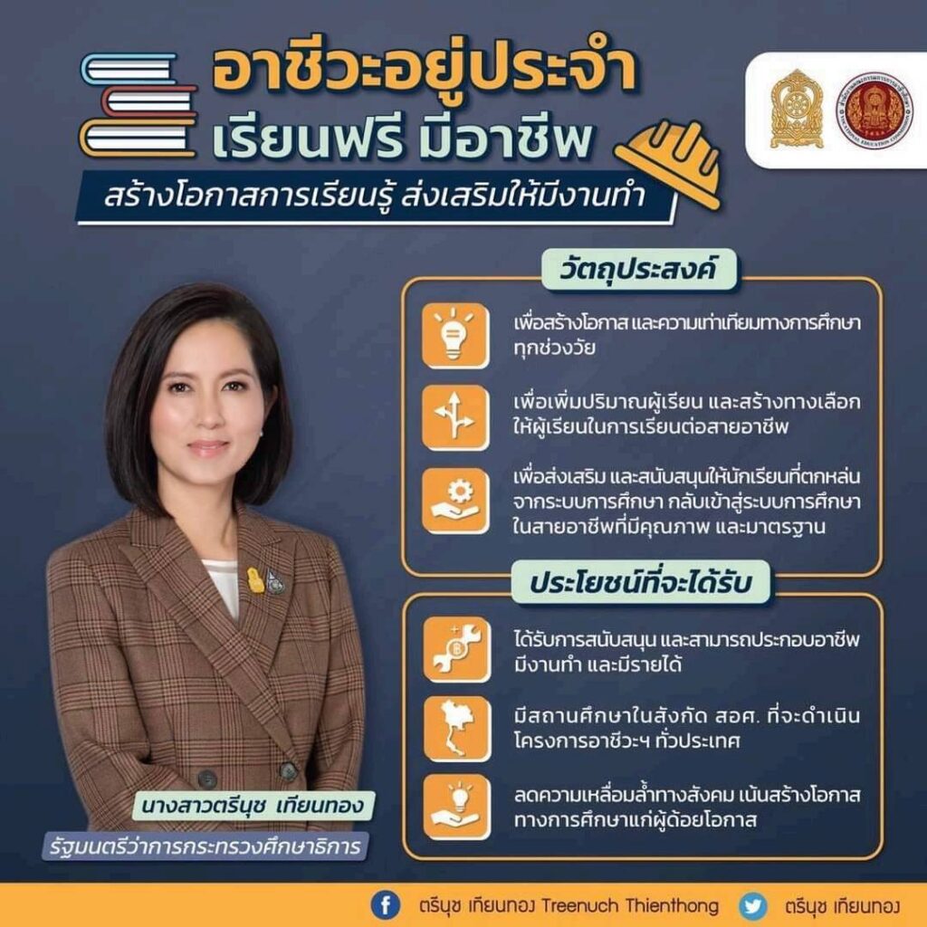นางสาวตรีนุช เทียนทอง รัฐมนตรีว่าการกระทรวงศึกษาธิการ (รมว.ศธ.) เปิดเผยว่า ตามที่คณะรัฐมนตรี (ครม.) ได้มีมติเมื่อวันที่ 7 มิถุนายน 2565 ให้กระทรวงศึกษาธิการ (ศธ.) โดยสำนักงานคณะกรรมการการอาชีวศึกษา (สอศ.) ดำเนินโครงการอาชีวะสร้างโอกาสทางการศึกษาให้เยาวชนเพื่อผลิตกำลังคนของประเทศ (อาชีวะอยู่ประจำ เรียนฟรี มีอาชีพ) โดยนำร่องในสถานศึกษาสังกัด สอศ.จำนวน 88 แห่ง ในปีงบประมาณ พ.ศ.2565 (ระยะที่ 1) ก่อนแล้วให้กำกับ ติดตาม และประเมินผลการดำเนินโครงการฯ ระยะที่ 1 อย่างต่อเนื่อง ซึ่งทาง สอศ.ได้เสนอคำขอเพิ่มงบประมาณรายจ่ายประจำปีงบประมาณ พ.ศ.2566 แต่ไม่ได้รับการพิจารณาในขั้นกรรมาธิการ จึงไม่มีงบฯ ดำเนินโครงการฯ ในปีงบฯ 2566 นั้น
