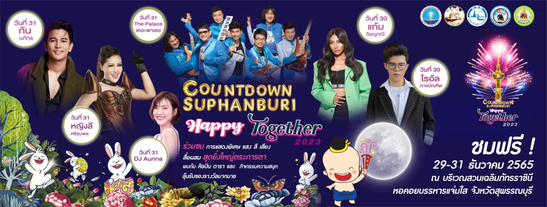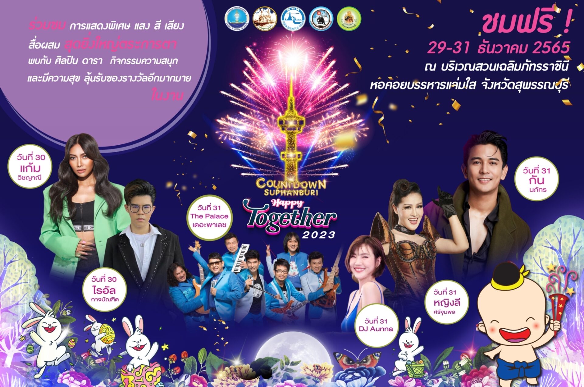 จังหวัดสุพรรณบุรี ร่วมกับ การท่องเที่ยวแห่งประเทศไทย (ททท.) พร้อมด้วย องค์การบริหารส่วนจังหวัดสุพรรณบุรี เทศบาลเมืองสุพรรณบุรี กระทรวงการท่องเที่ยวและกีฬา กระทรวงทรัพยากรธรรมชาติและสิ่งแวดล้อม หอการค้าจังหวัดสุพรรณบุรี สวนเฉลิมภัทรราชินี และหน่วยงานภาครัฐและเอกชน จัดงาน “Countdown Suphanburi Happy Together 2023” ณ บริเวณสวนเฉลิมภัทรราชินี หอคอยบรรหาร-แจ่มใส อำเภอเมือง จังหวัดสุพรรณบุรี ระหว่างวันที่ 29 – 31 ธันวาคม 2565 โดยปีนี้ขยายการจัดงานเพิ่มขึ้นเป็น 3 วัน เพื่อผลักดันให้หอคอยบรรหาร-แจ่มใส เป็น Landmark สำคัญที่นักท่องเที่ยวต้องมาเยือนในช่วงเทศกาลส่งท้ายปีเก่า-ต้อนรับปีใหม่ เชิญชวนนักท่องเที่ยวทั้งชาวไทยและชาวต่างชาติ ตลอดจนชาวสุพรรณบุรีร่วมนับถอยหลังสู่ปี 2023 ไปพร้อมๆกัน