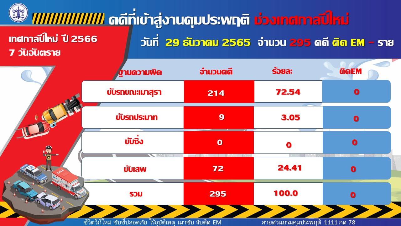 กทม. 30 ธ.ค.- อธิบดีกรมคุมประพฤติ เผยวันแรกรณรงค์ป้องกันและลดอุบัติเหตุช่วงปีใหม่ 2566 มีคดีทั้งสิ้น 295 คดี ขณะที่คดีเมาขับ เพิ่มจากปีที่แล้ว 98%