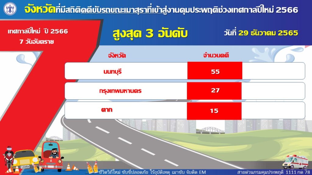 วันนี้ (30 ธันวาคม 2565) นายวีระกิตติ์ หาญปริพรรณ์ อธิบดีกรมคุมประพฤติ เปิดเผยถึงสถิติคดีที่ศาลสั่งคุมความประพฤติวันที่ 29 ธันวาคม 2565 วันแรกของการรณรงค์ป้องกันและลดอุบัติเหตุในช่วงเทศกาลปีใหม่ 2566 มีคดีทั้งสิ้น 295 คดี จำแนกเป็น คดีขับรถขณะเมาสุรา 214 คดี คิดเป็นร้อยละ 72.54 คดีขับรถประมาท 9 คดี คิดเป็นร้อยละ 3.05 และคดีขับเสพ 72 คดี คิดเป็นร้อยละ 24.41 เมื่อเปรียบเทียบคดีขับรถขณะเมาสุราปีใหม่ 2565 มีจำนวน 108 คดี กับ ปีใหม่ 2566 จำนวน 214 คดี พบว่า เพิ่มขึ้น 106 คดี คิดเป็นร้อยละ 98 สำหรับจังหวัดที่มีสถิติคดีขับรถขณะเมาสุราสูงสุด 3 อันดับ ได้แก่ นนทบุรี 55 คดี กรุงเทพมหานคร 27 คดี และตาก 15 คดี