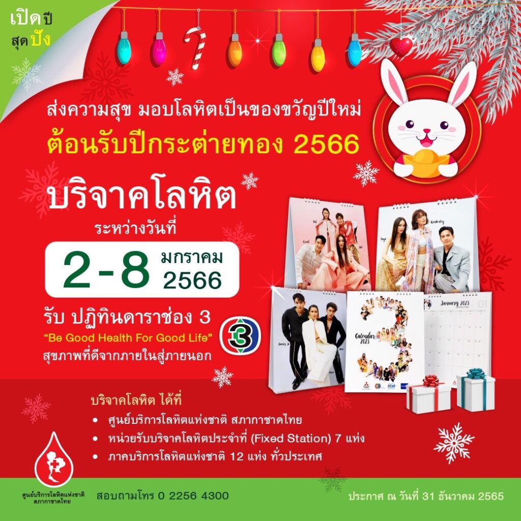•วันที่ 2 – 8 มกราคม 2566 บริจาคโลหิตในโครงการ “บริจาคโลหิต เป็นของขวัญปีใหม่ให้กับผู้ป่วย” รับปฏิทินดารา ช่อง 3 “Be Good Health For Good Life” สุขภาพที่ดีจากภายในสู่ภายนอก