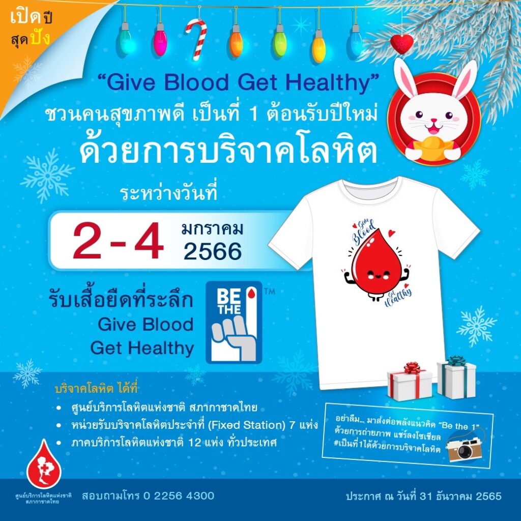 •วันที่ 2 – 4 มกราคม 2566 บริจาคโลหิตในโครงการ “Give Blood Get Healthy” พร้อมเป็นที่ 1 ได้ด้วยการบริจาคโลหิต รับเสื้อยืดที่ระลึก “Be the 1” Give Blood Get Healthy