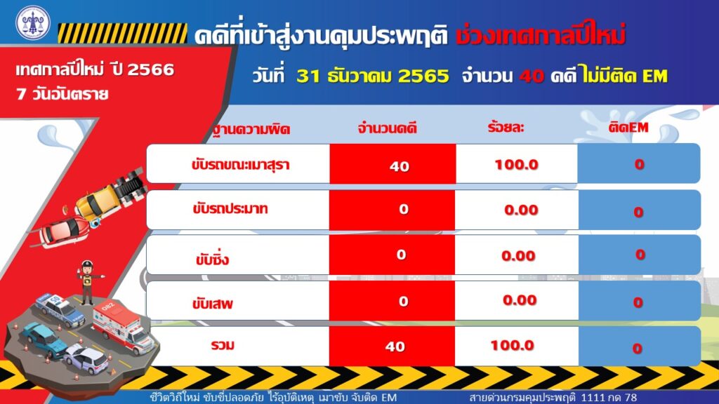 อธิบดีกรมคุมประพฤติกล่าวเพิ่มเติมว่า จังหวัดที่มีสถิติคดีขับรถขณะเมาสุราสะสมสูงสุด 3 อันดับ ได้แก่ นนทบุรี 120 คดี สมุทรปราการ 105 คดี และกรุงเทพมหานคร 93 คดี เมื่อเปรียบเทียบสถิติคดีที่เข้าสู่งานคุมประพฤติในวันส่งท้ายปีเก่าต้อนรับปีใหม่ (31 ธันวาคม ) พบว่า คดีขับรถในขณะเมาสุรา ปี พ.ศ. 2564 จำนวน 1,723 คดี และปี พ.ศ. 2565 จำนวน 40 คดี ลดลง จำนวน 1,683 คดี คิดเป็นร้อยละ 97