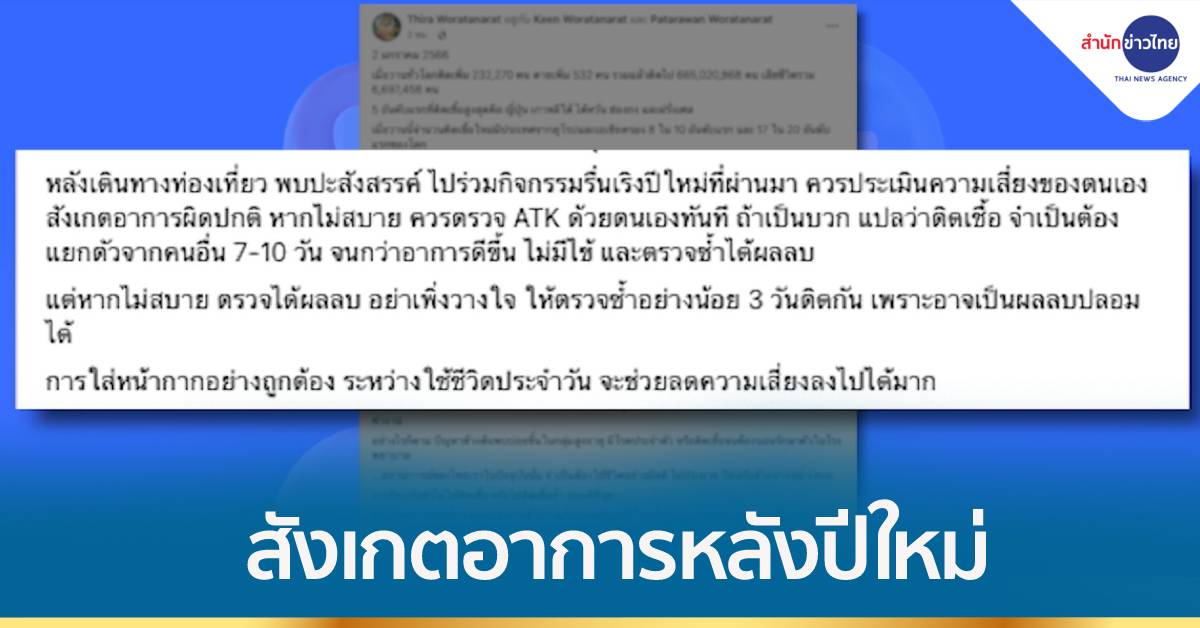2 ม.ค. – “หมอธีระ” เตือนประชาชนไม่ประมาท สังเกตอาการหลังกลับจากฉลองปีใหม่ หากไม่สบาย ควรตรวจ ATK ทันที และควรตรวจซ้ำ ขณะที่ทั่วโลกเมื่อวานนี้ติดเชื้อเพิ่มกว่า 2 แสนคน ตาย 532 คน