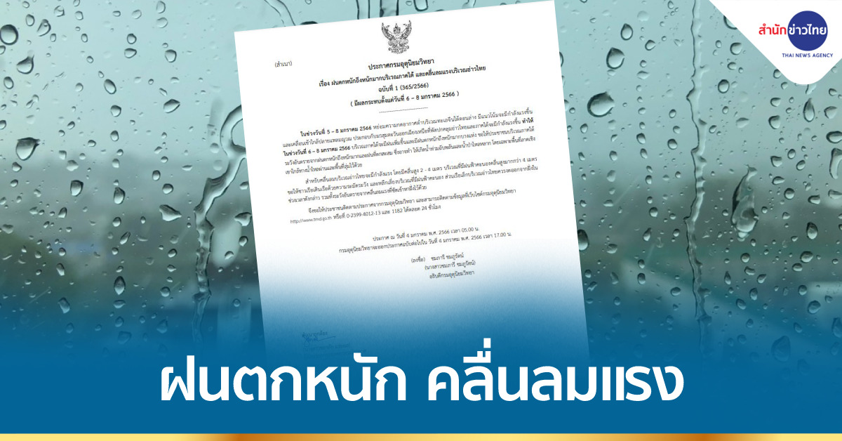 ประกาศกรมอุตุนิยมวิทยา เรื่อง ฝนตกหนักถึงหนักมากบริเวณภาคใต้ และคลื่นลมแรงบริเวณอ่าวไทย ฉบับที่ 1 (365/2566) มีผลกระทบตั้งแต่วันที่ 6 – 8 มกราคม 2566
