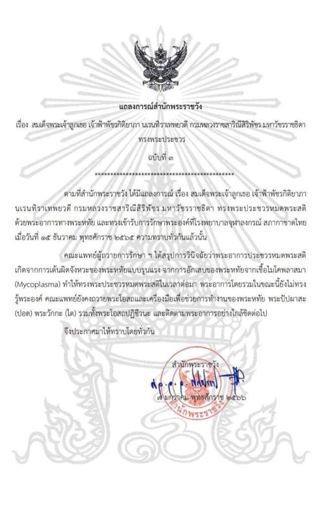 8 ม.ค.– แถลงการณ์สำนักพระราชวัง เรื่อง สมเด็จพระเจ้าลูกเธอ เจ้าฟ้าพัชรกิติยาภา นเรนทิราเทพยวดี กรมหลวงราชสาริณีสิริพัชร มหาวัชรราชธิดา ทรงพระประชวร ฉบับที่ ๓