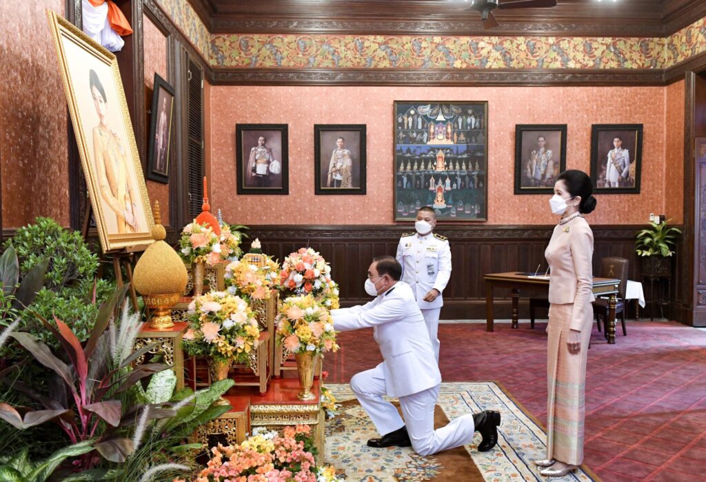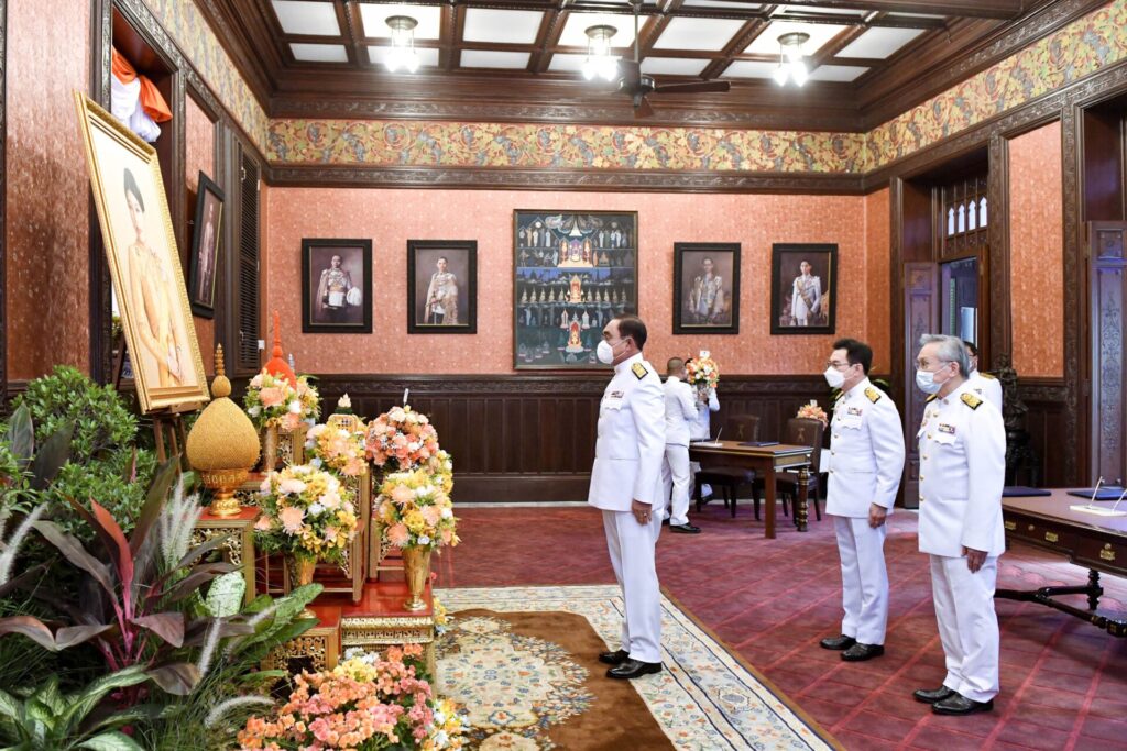 ชุดที่ 1 นายกรัฐมนตรี ถวายความเคารพและทูลเกล้าถวายแจกันดอกไม้ในนาม “นายกรัฐมนตรีและคณะรัฐมนตรี” พร้อมด้วยรองนายกรัฐมนตรี