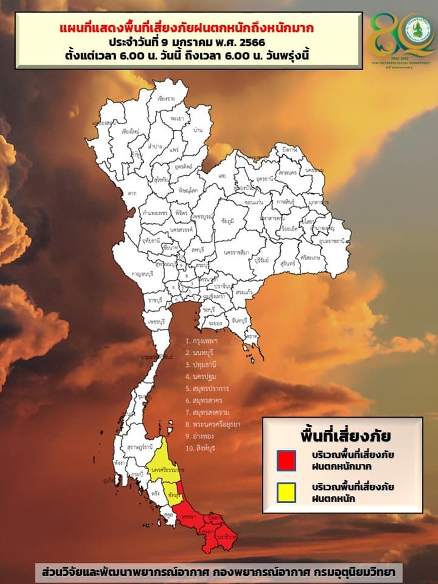 สำหรับมรสุมตะวันออกเฉียงเหนือที่พัดปกคลุมอ่าวไทยและภาคใต้เริ่มมีกำลังอ่อนลง ประกอบกับมีหย่อมความกดอากาศต่ำปกคลุมบริเวณทะเลจีนใต้ตอนล่าง และมีแนวโน้มเคลื่อนเข้าใกล้บริเวณปลายแหลมญวน ทำให้ภาคใต้ตอนล่างยังคงมีฝนตกหนักถึงหนักมากบางแห่ง ส่วนคลื่นลมบริเวณอ่าวไทยตอนล่างมีกำลังปานกลาง โดยมีคลื่นสูงประมาณ 2 เมตร บริเวณที่มีฝนฟ้าคะนองคลื่นสูงมากกว่า 2 เมตร ขอให้ชาวเรือบริเวณอ่าวไทยเดินเรือด้วยความระมัดระวัง และหลีกเลี่ยงการเดินเรือในบริเวณที่มีฝนฟ้าคะนอง