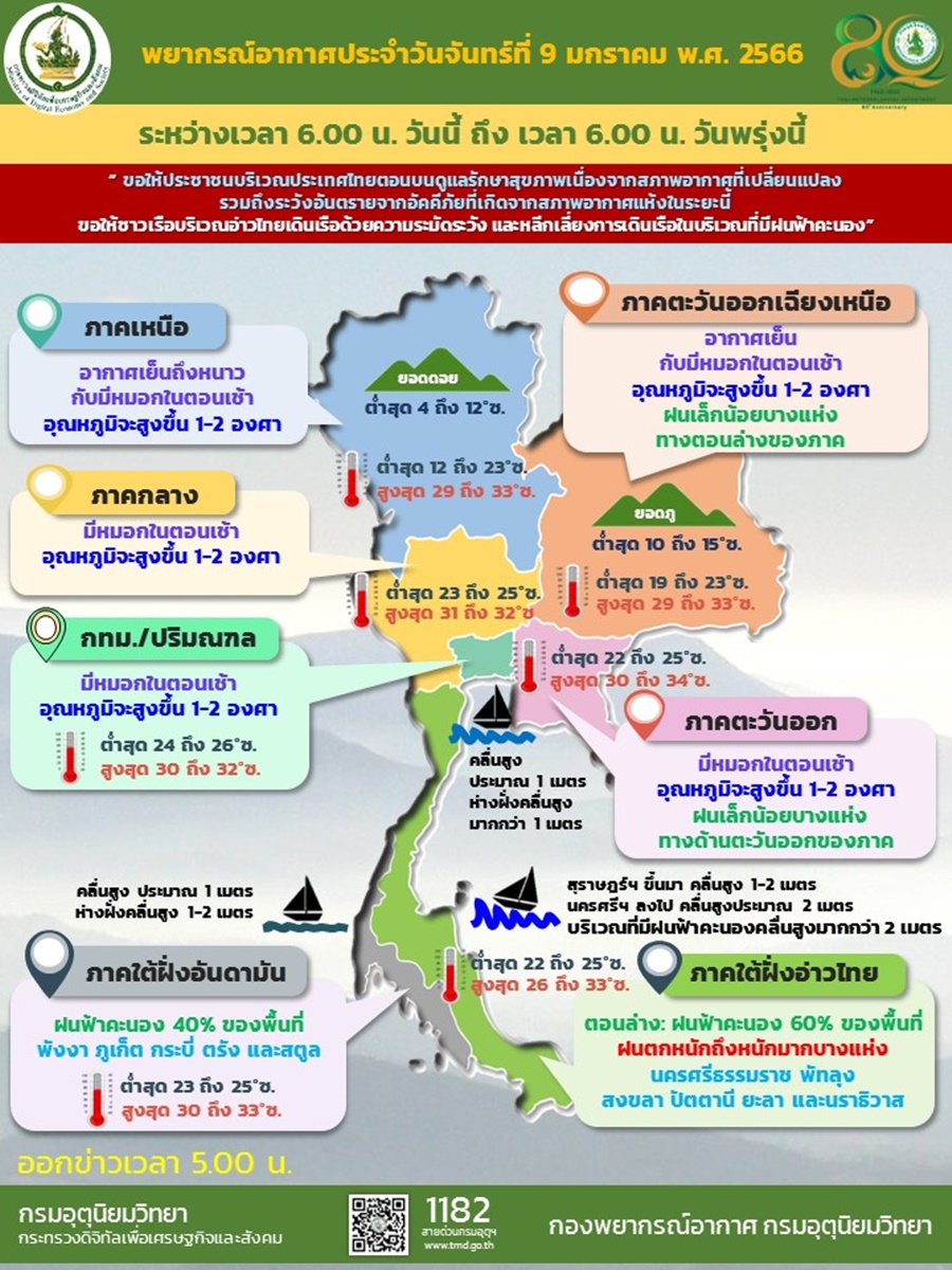 กรมอุตุฯ 9 ม.ค. – กรมอุตุฯ เผยไทยตอนบน รวมทั้งกรุงเทพฯ-ปริมณฑล อุณหภูมิสูงขึ้น 1-2 องศาฯ กับมีหมอกตอนเช้า ขณะที่ภาคใต้ตอนล่างยังคงมีฝนตกหนักถึงหนักมากบางแห่ง