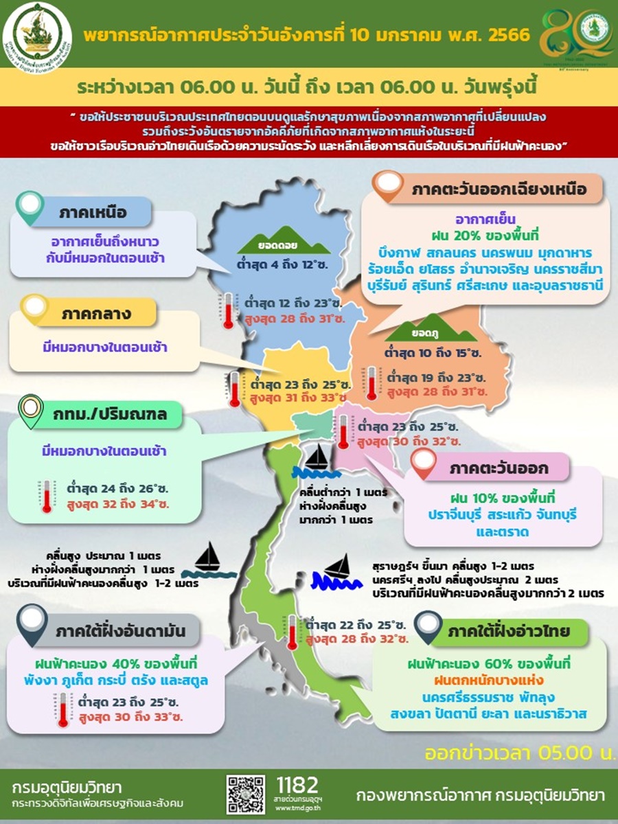 กรมอุตุฯ 10 ม.ค. – กรมอุตุฯ เผยภาคเหนืออากาศเย็นถึงหนาว ส่วนภาคอีสานอากาศเย็น กับมีฝนบางแห่ง ขณะที่ภาคใต้ตอนล่างยังคงมีฝนตกหนักถึงหนักมากบางพื้นที่