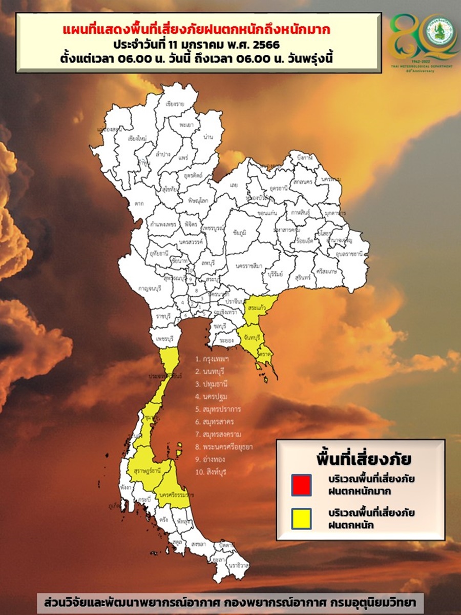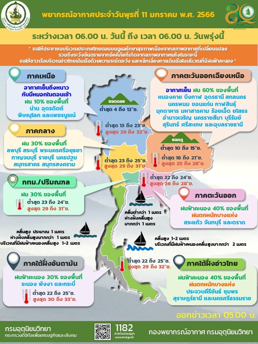 กรมอุตุฯ 11 ม.ค. – กรมอุตุฯ เผยภาคเหนือ-อีสาน อากาศเย็นถึงหนาว มีหมอกตอนเช้า และมีฝนฟ้าคะนอง ขณะที่ภาคใต้ฝนตกหนักบางแห่ง ส่วนกรุงเทพฯ-ปริมณฑล มีฝน 30% ของพื้นที่