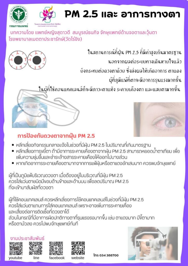 นครปฐม 11 ม.ค. – รพ.เมตตาฯ (วัดไร่ขิง) กรมการแพทย์ ห่วงใยในภาวะฝุ่น PM2.5 ที่มีค่าสูงเกินมาตรฐาน อาจส่งผลต่อดวงตา หากมีอาการตาแห้ง ระคายเคืองตา ตาแดง ขี้ตามาก ตาสู้แสงไม่ได้ ตามัวลง ควรพบจักษุแพทย์