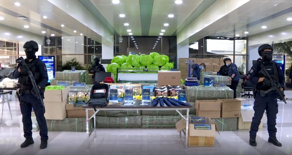 พร้อมพาสื่อชมของกลาง ขององค์กรการค้ายาเสพติดระหว่างประเทศ ซึ่งหน่วย SITF เพิ่งจับกุมได้ เริ่มจากศุลกากรตรวจยึดไอซ์ 51 กก. ซุกซ่อนในพรมเตรียมส่งไปฮ่องกงที่ท่าเรือกรุงเทพ ก่อนที่หน่วย SITF จะขยายผลจับกุมผู้ต้องหาพร้อมของกลาง เป็นเฮโรอีน 78 กก. ไอซ์ 20 กรัม และอุปกรณ์บรรจุสินค้า ซึ่งหากไม่สามารถจับกุมได้ยาเสพติดเหล่านี้จะถูกส่งไปยังต่างประเทศเป็นจำนวนมาก