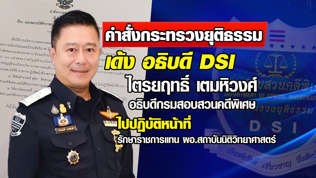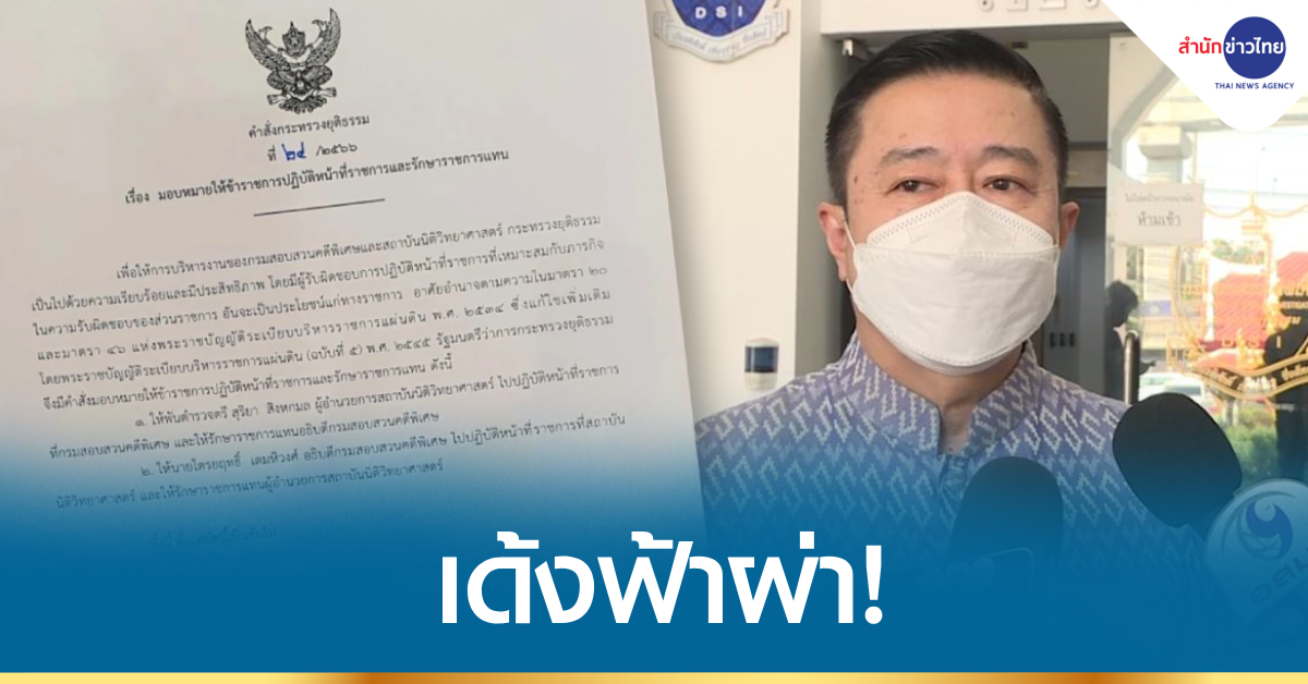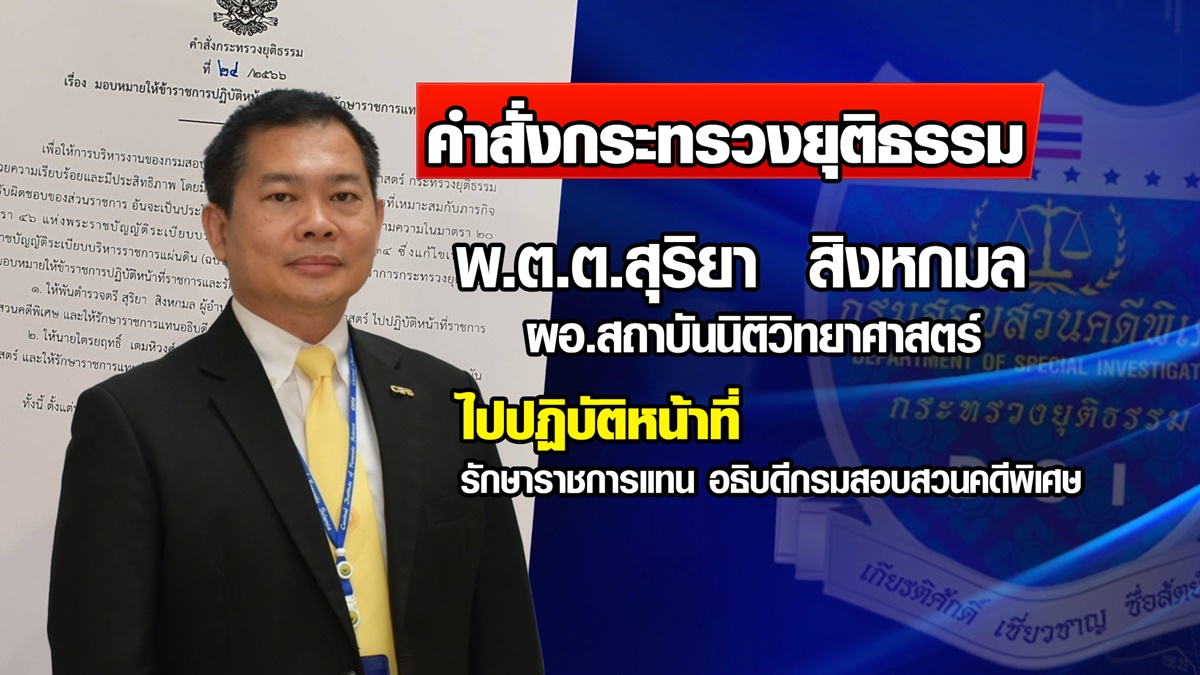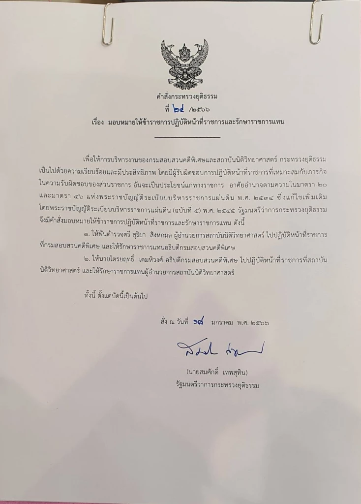 ผู้สื่อข่าวรายงานจากกระทรวงยุติธรรม ว่า วันนี้ (18 ม.ค.66) นายสมศักดิ์ เทพสุทิน รัฐมนตรีว่าการกระทรวงยุติธรรม ลงนามในคำสั่งมอบหมายให้ข้าราชการปฏิบัติหน้าที่ราชการและรักษาราชการแทน โดยให้นายไตรยฤทธิ์ เตมหิวงศ์ อธิบดีกรมสอบสวนคดีพิเศษ ไปปฏิบัติหน้าที่ราชการที่สถาบันนิติวิทยาศาสตร์ และรักษาราชการแทน ผอ.สถาบันนิติวิทยาศาสตร์ และให้ พ.ต.ต.สุริยา สิงหกมล ผู้อำนวยการสถาบันนิติวิทยาศาสตร์ ไปปฏิบัติหน้าที่ราชการที่กรมสอบสวนคดีพิเศษ และให้รักษาราชการแทนอธิบดีกรมสอบสวนคดีพิเศษ